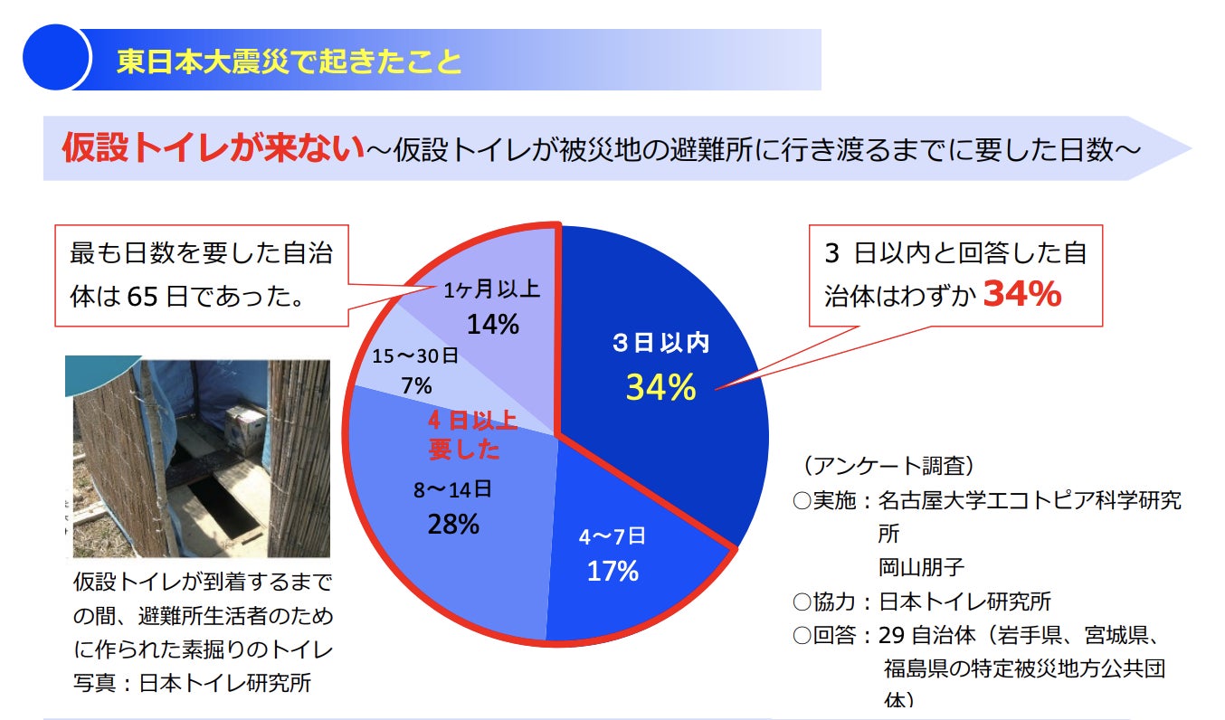 しかし、仮設トイレが避難所に行き渡るまで非常に多くの日数がかかるのはあまり知られておりません。