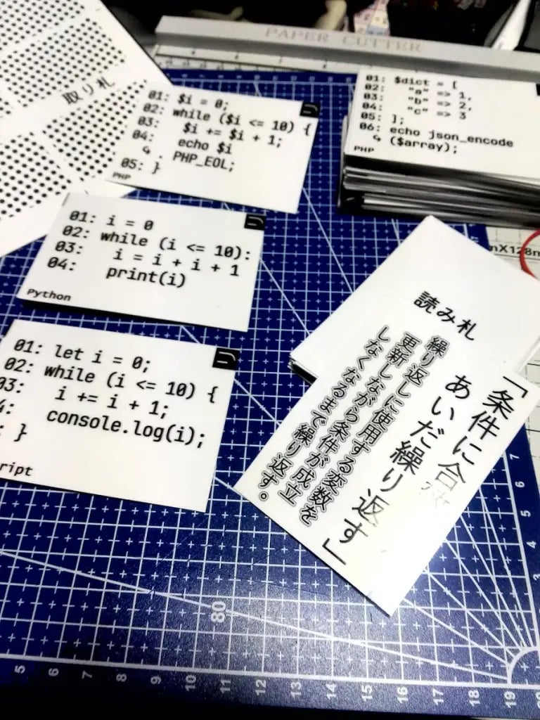 取り札にはコードが書かれていますが、それだけでなくプログラミング言語の言語名と、読み札と共通のイロハのラベルを付与していました。これはいわゆる「初心者救済のための要素」です。