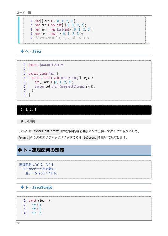 現在制作中の豪華版へセットする『横断プログラミングかるた第二版コードブック』(解説書籍)のキャプチャー画像(現在制作中のためレイアウトや内容は今後変更になります)。