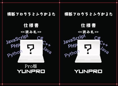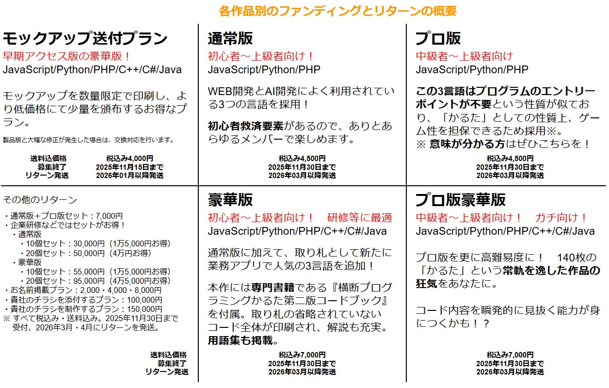 ・プロ版豪華版:JavaScript/Python/PHP/C++/C#/Javaと、解説本をセットに。プログラミングの中級者~上級者向け。初心者救済要素(言語名・取り札と読み札共通のイロハラベル)が存在しない。