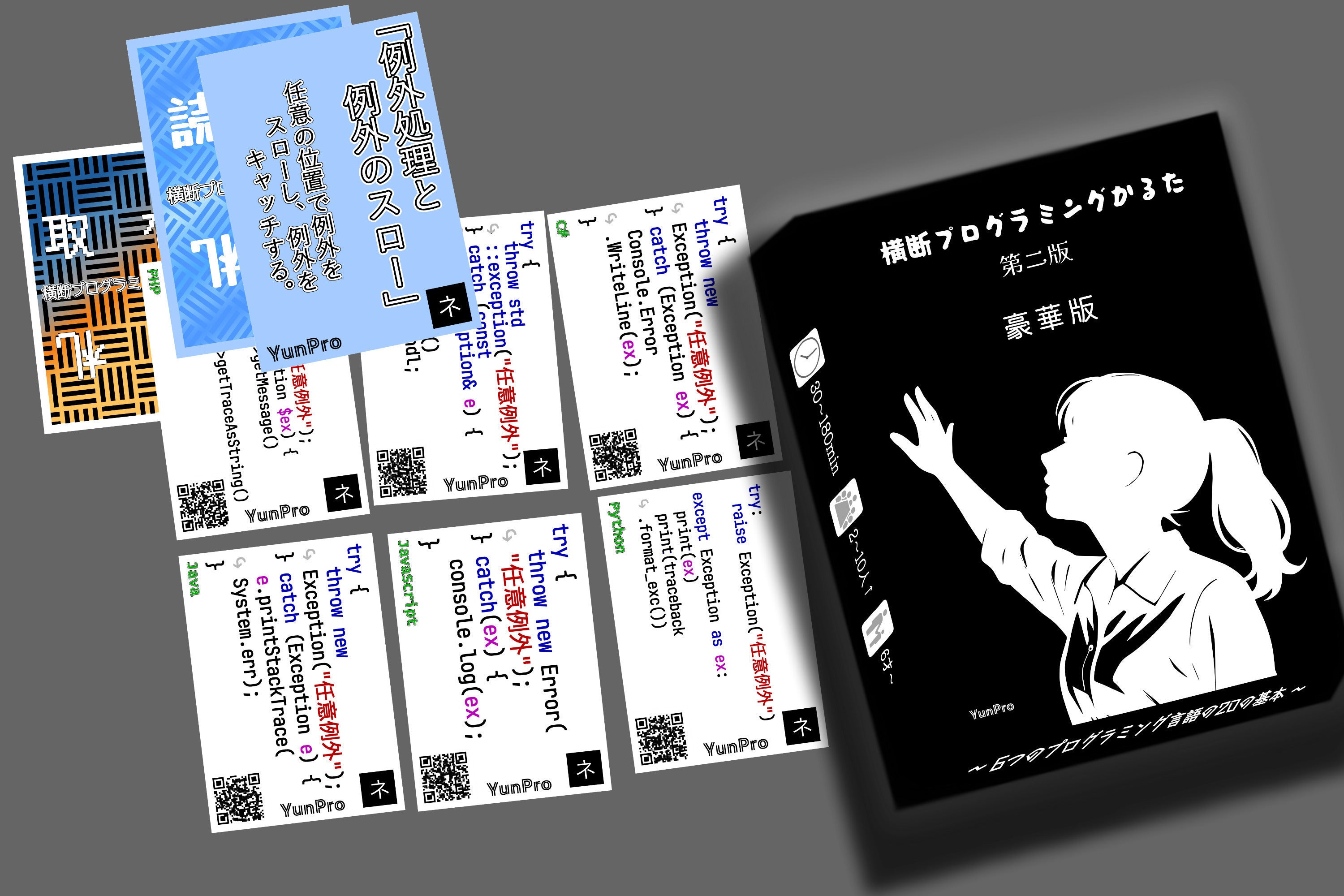 『横断プログラミングかるた』(以降、無印版と表記)や『横断プログラミングかるた第二版』(以降、第二版と表記)では、昨今の事情に鑑みて、「複数のプログラミング言語を自在に理解できる能力の育成」をメインの目的として定めました。