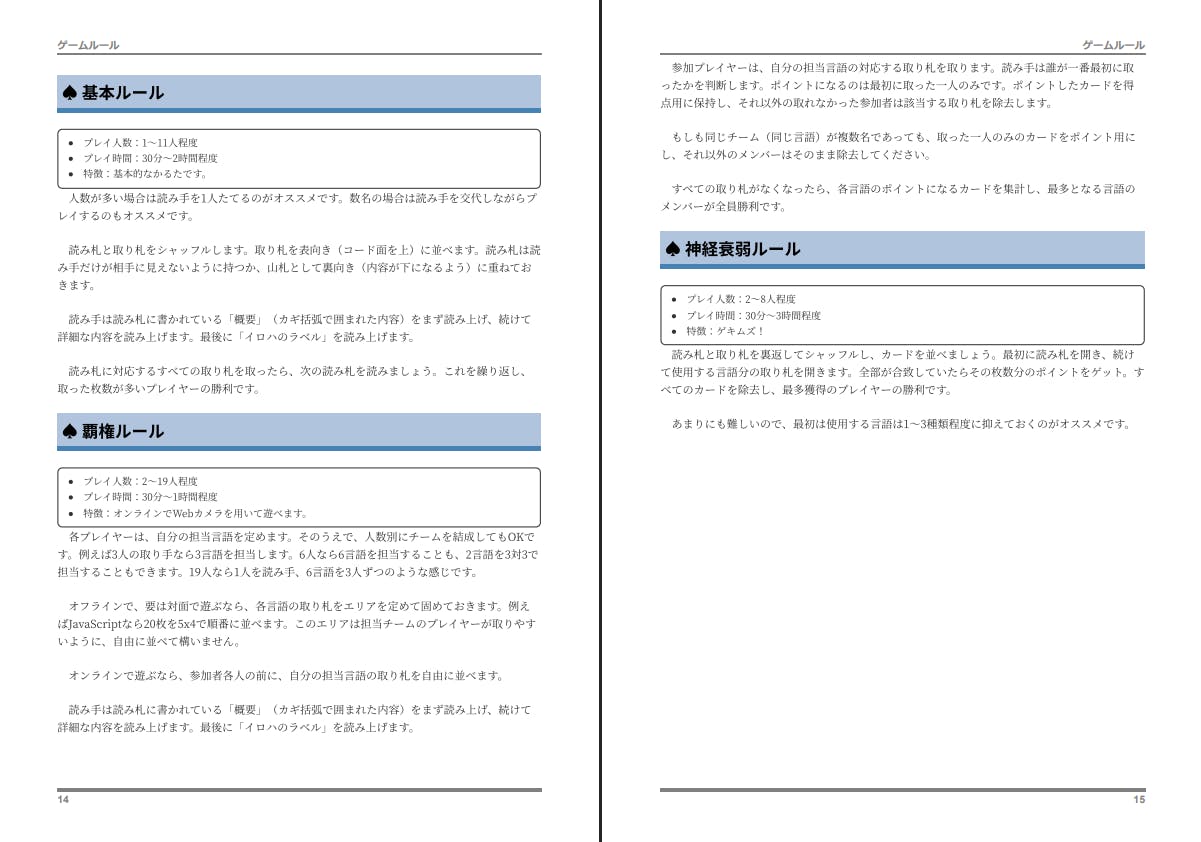 オフラインで、要は対面で遊ぶなら、各言語の取り札をエリアを定めて固めておきます。例えばJavaScriptなら20枚を5x4で順番に並べます。このエリアは担当チームのプレイヤーが取りやすいように、自由に並べて構いません。