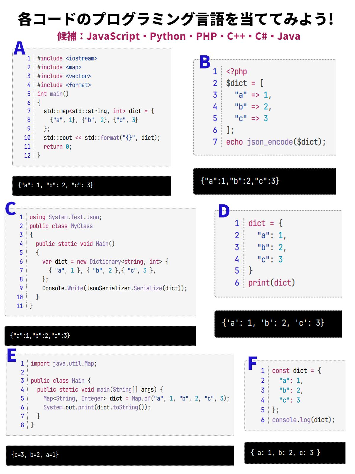 今回は、プログラミング言語全部を知らなくとも、知識のある方なら答えられるように配慮してみました。