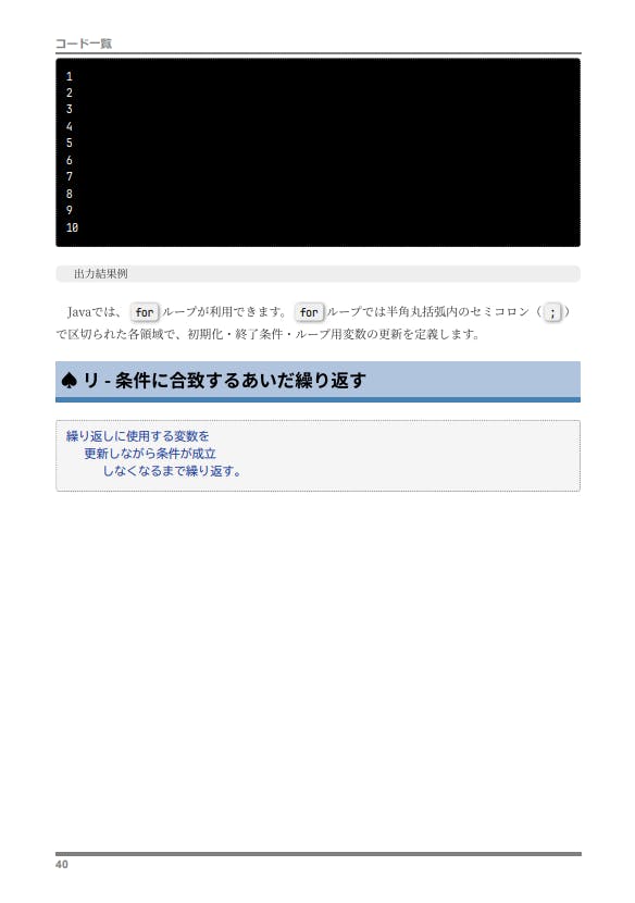 さて、次に公開するのは「リ-条件に合致するあいだ繰り返す」であり、「繰り返しに使用する変数を更新しながら条件が成立しなくなるまで繰り返す。」となっています。