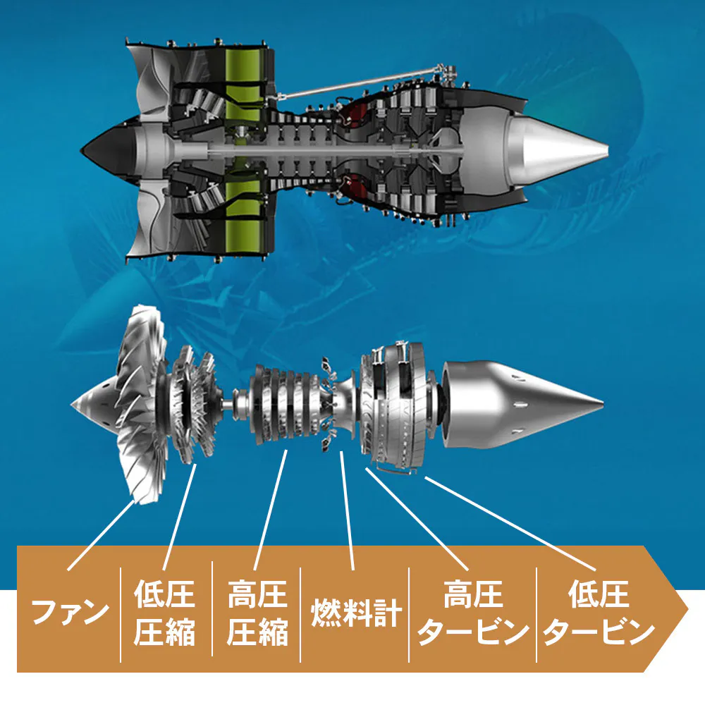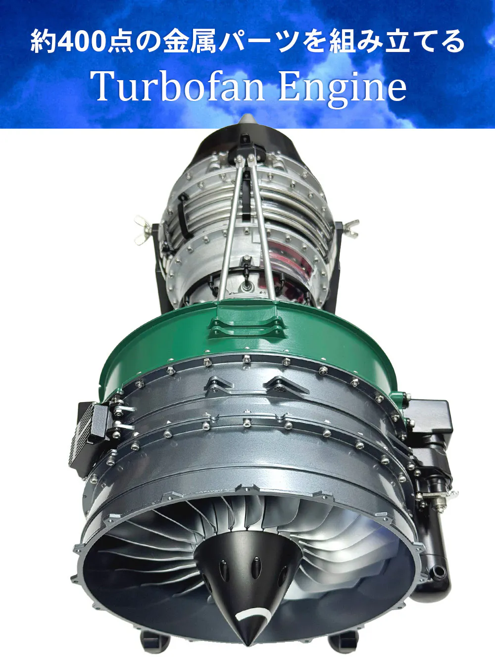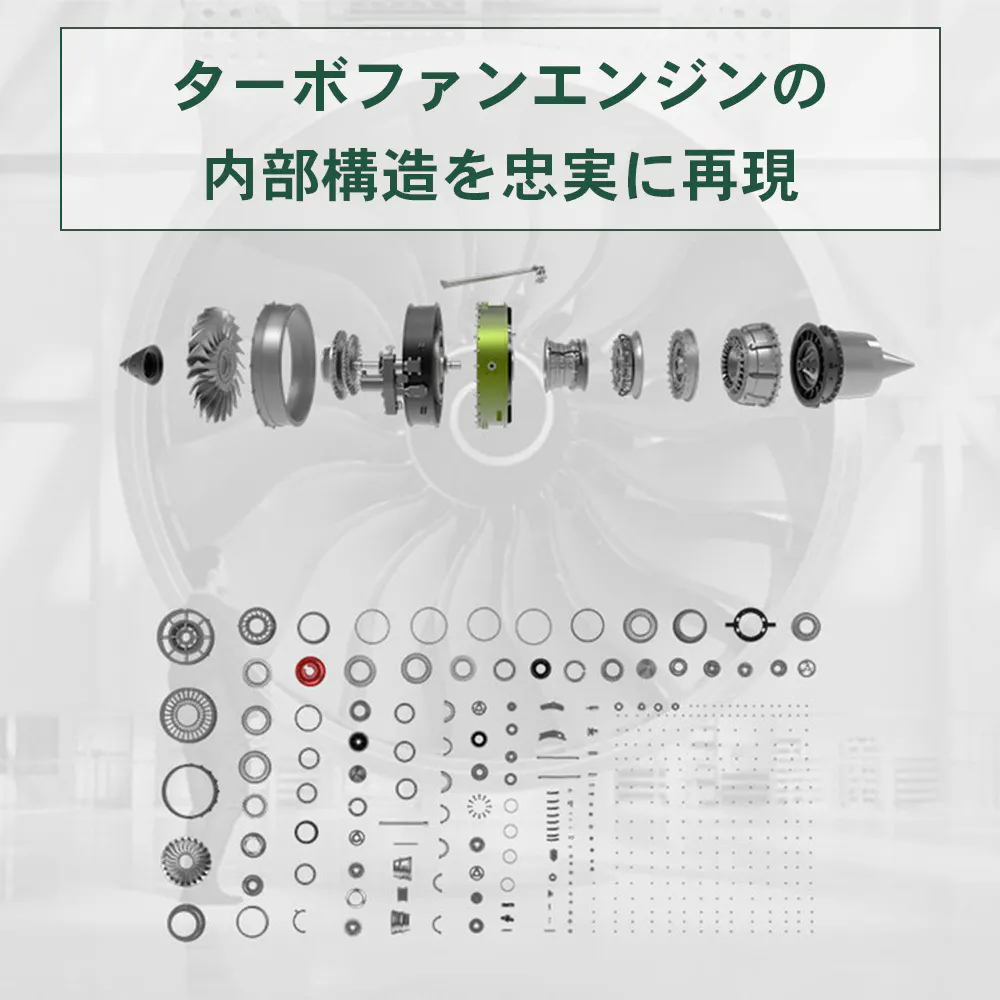 民間機航空機に幅広く採用されているターボファンエンジンの構造と原理を忠実に再現した1/10縮尺モデルです。精巧に作らた1つ1つのパーツを組立ながら、複雑なエンジン構造をひも解いてその原理を理解そして知識を養えます。完成後はアクセサリーギアボックスに取り付けられたモーターで全体を動作させることができます。いわゆるジェットエンジンの内部がどうなっているかを知る貴重な模型でもあります。