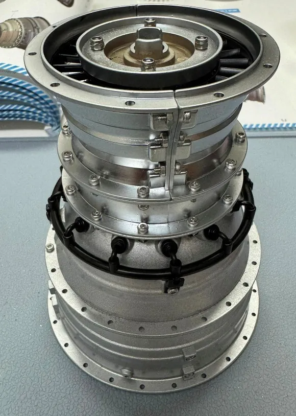 透明な窓を設けて内部が見えるように作られ、圧縮工程から燃焼、タービンへの工程が把握できるモデルになっています。構造を知るうえで各部のファンの動きが見れるのは貴重な体験になります。