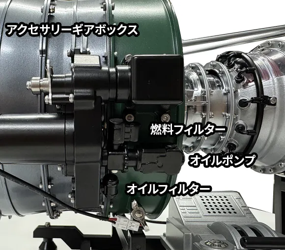 スターターとして使われるギアボックスも再現され、ポンプ類の補器類もしっかり再現されています。航空機マニアにも納得できる作りになっています。