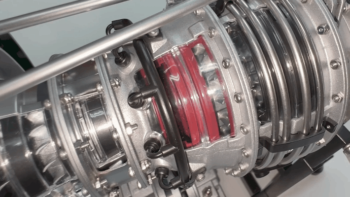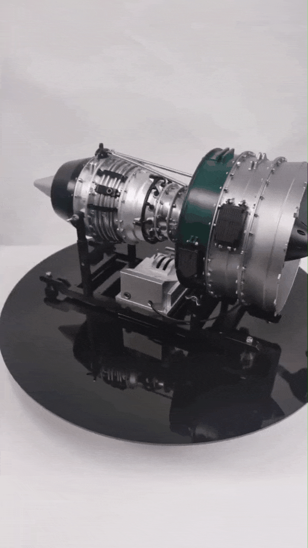 実物大のエンジンを忠実に再現し、視覚的にも美しいこのモデルは、前方のファンから低圧圧縮→高圧圧縮→燃焼→高圧タービン→低圧タービンなどを備えた実物エンジンをリアルに再現しています。