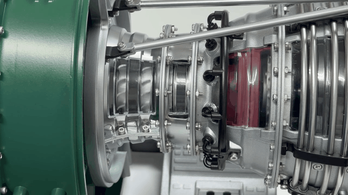 透明な窓を設けて内部が見えるように作られ、圧縮工程から燃焼、タービンへの工程が把握できるモデルになっています。構造を知るうえで各部のファンの動きが見れるのは貴重な体験になります。
