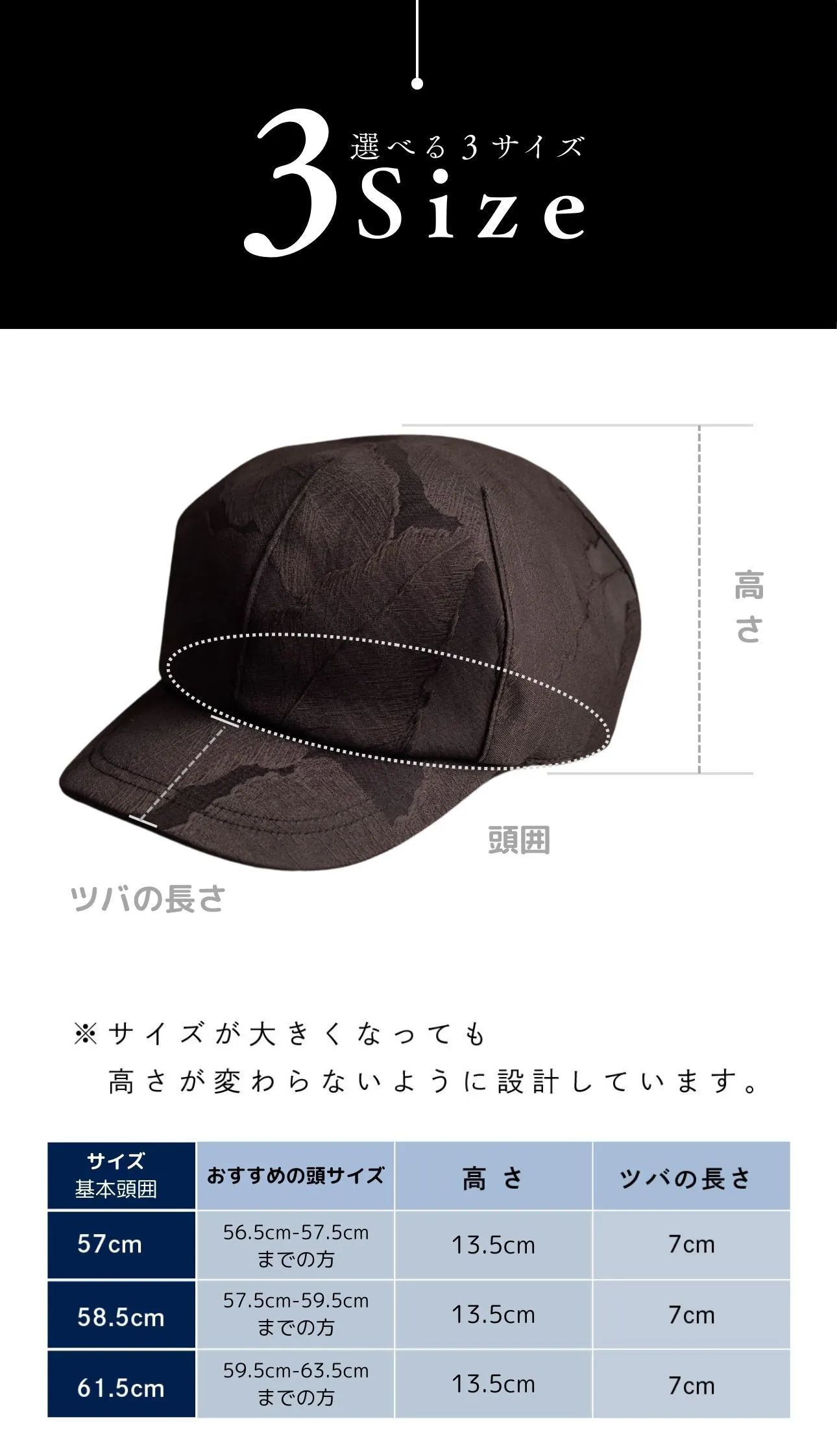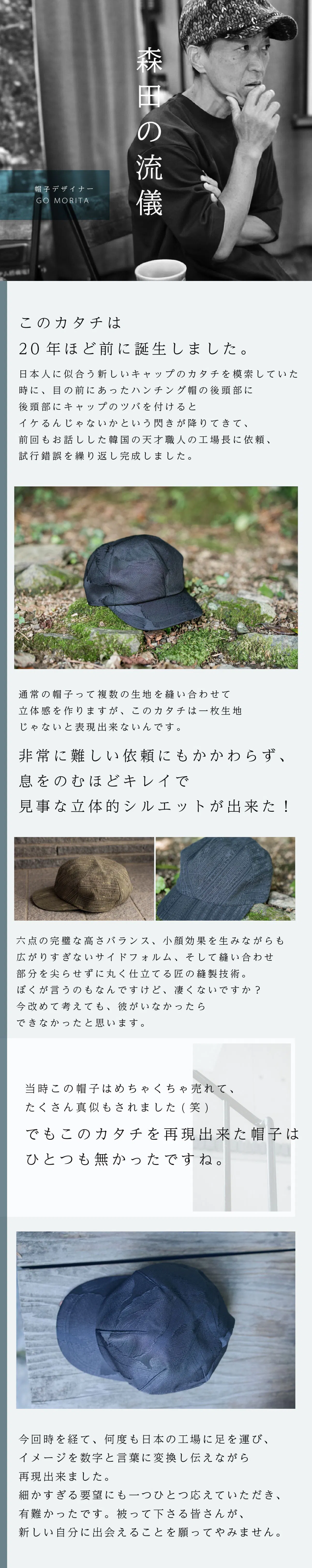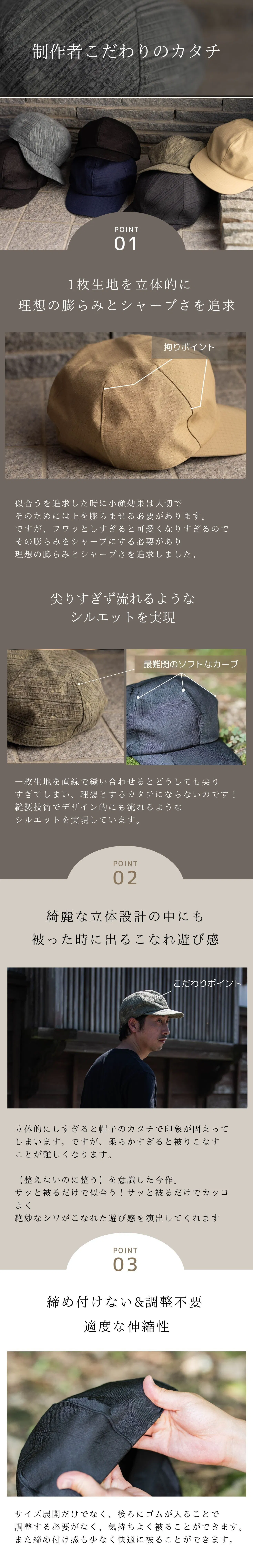 実店舗では、千点以上ある商品がある中で直接会話や試着をしながら、【似合う】をお届けできる商品はあっても、オンラインで【似合う】を届けることはとても難しく、オンラインでより多くのお客様に【新しい自分に出会う喜び】を届ける方法はないかと考えた結果、世にある多くはコーカソイドの骨格に合わせて作られた帽子が多く、日本人の骨格に合わせて開発された帽子はとても、少ないことに気づきましたので、日本人の頭のカタチを研究し、サイズ展開も普通、大きい、超大きいをつくることで、多くの悩める人に喜んでもらえるのではないかと思い今作を開発いたしました。