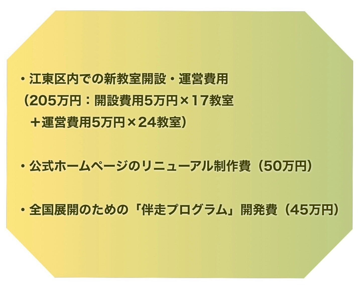 ※目標金額を超えた場合は、さらなる新教室の開設費用および全国ネットワーク構築費用に充てさせていただきます。