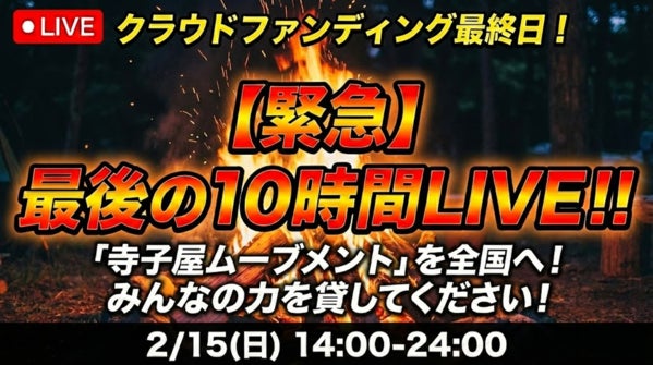 2026/02/15 07:00さまざまな形で寺子屋みなてらすに関わってくださっている方のメッセージを繋ぐ #寺子屋ムーブメントバトンリレー最後は、今回のクラウドファンディングのプロジェクトリーダー、渡邊和樹よりメッセージです。今日、この機会に、寺子屋ムーブメントに乗っかってみませんか。「寺子屋ムーブメント」のクラウドファンディング。いよいよ今日が最終日です。今日は難しいことは言いません。このプロジェクトにちょっとでも心が動いたそこのあなた。今日、この機会に、寺子屋ムーブメントに乗っかってみませんか。なぜなら、きっとそれは楽しいことだから。楽しさには、いろんなカタチがあります。多くの仲間がこのクラウドファンディングの期間に寺子屋に関わることへの自分独自の楽しさを表現してくれました。その楽しさは、クラファンの活動報告にたくさんアップした、#寺子屋ムーブメントバトンリレー#みなてらすボランティアインタビュー今年卒業する生徒へのインタビューなどを読んでいただければ伝わると思います。その他にも、クラファンの応援コメントFacebookでのシェア個別に送ってもらったメッセージ支援者とのオフ会でいただいた言葉などで、多くの方がそれぞれの楽しさを表現してくださりました。それらが折り重なることで、昨年末に産声を上げた寺子屋ムーブメントは大きく育ってきています。この楽しさの雰囲気をちょっとでも感じていただいた方なら、きっと仲間になることでその楽しさをもっと一緒に味わえると思います!ぜひ、仲間になってください!!そして本日、そんな寺子屋ムーブメントの楽しさをともにする時間をつくりました!14時から24時までのクラウドファンディングの最後の10時間を、なんとYouTubeで生配信します!!https://www.youtube.com/live/_woeekapaLAしかも、今回のクラファンプロジェクトを楽しんでくれた仲間が、たくさん配信会場やZoomで参加してくれます!!少しの時間でもいいので、私たちの"いま"、寺子屋ムーブメントの"いま"を観てください!!そして、そこに楽しさや未来の可能性を感じ取っていただけたら、ぜひ最後応援してください!!昨日、支援額が目標の70%、210万を突破しました。目標を達成できれば、寺子屋ムーブメントは絶対にもっと楽しくなります。そして、寺子屋ムーブメントを楽しむ人が増えれば、それだけ多くの子どもたちの可能性も開かれていきます。これまでの5年間、そして今回の寺子屋ムーブメントの盛り上がりを通して、確信を持って言えます。最後にもう一度。今日、この機会に、寺子屋ムーブメントに乗っかってみませんか。#寺子屋ムーブメントバトンリレー もっと見る
