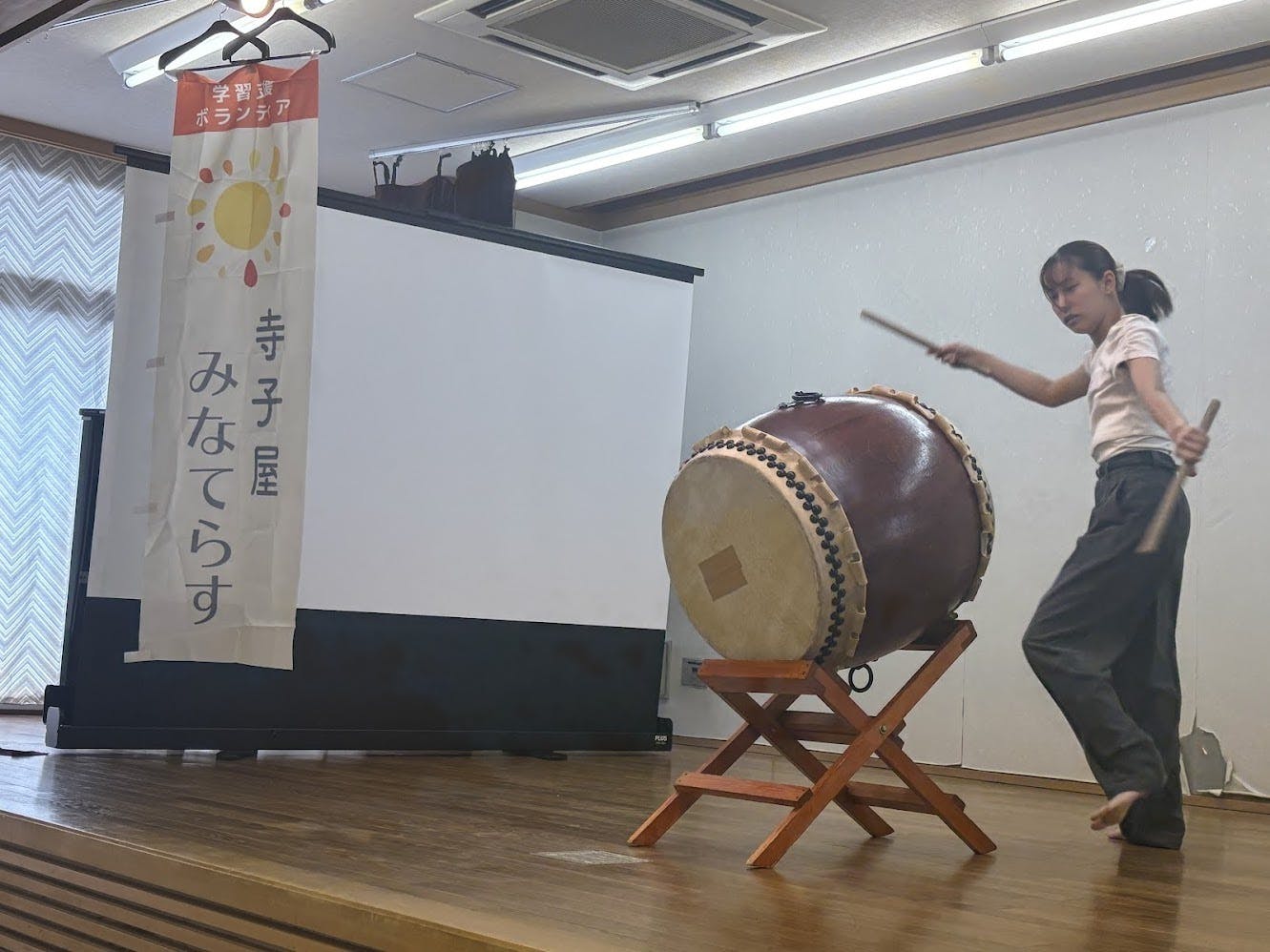 ↑寺子屋みなてらす5周年記念イベントで、特技の太鼓を披露する美友さん