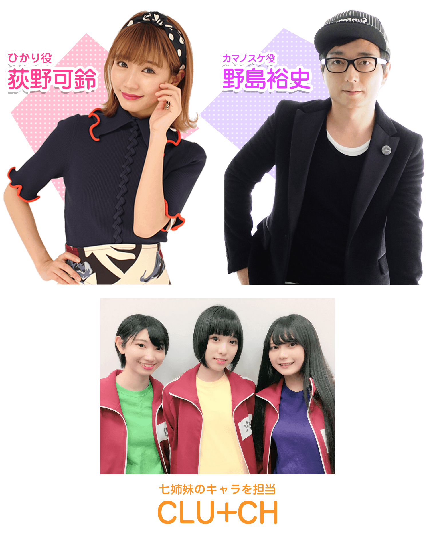 また、バトルの相手カマノスケ役は、「弱虫ペダル」でもおなじみの声優、野島裕史さん。そのほか、新人の声優アイドルユニット「CLU+CH(クラッチ)」も、町田美優さん、宍戸智恵さん、石原千尋さんの三人が、それぞれ七姉妹のキャラとして声を担当。