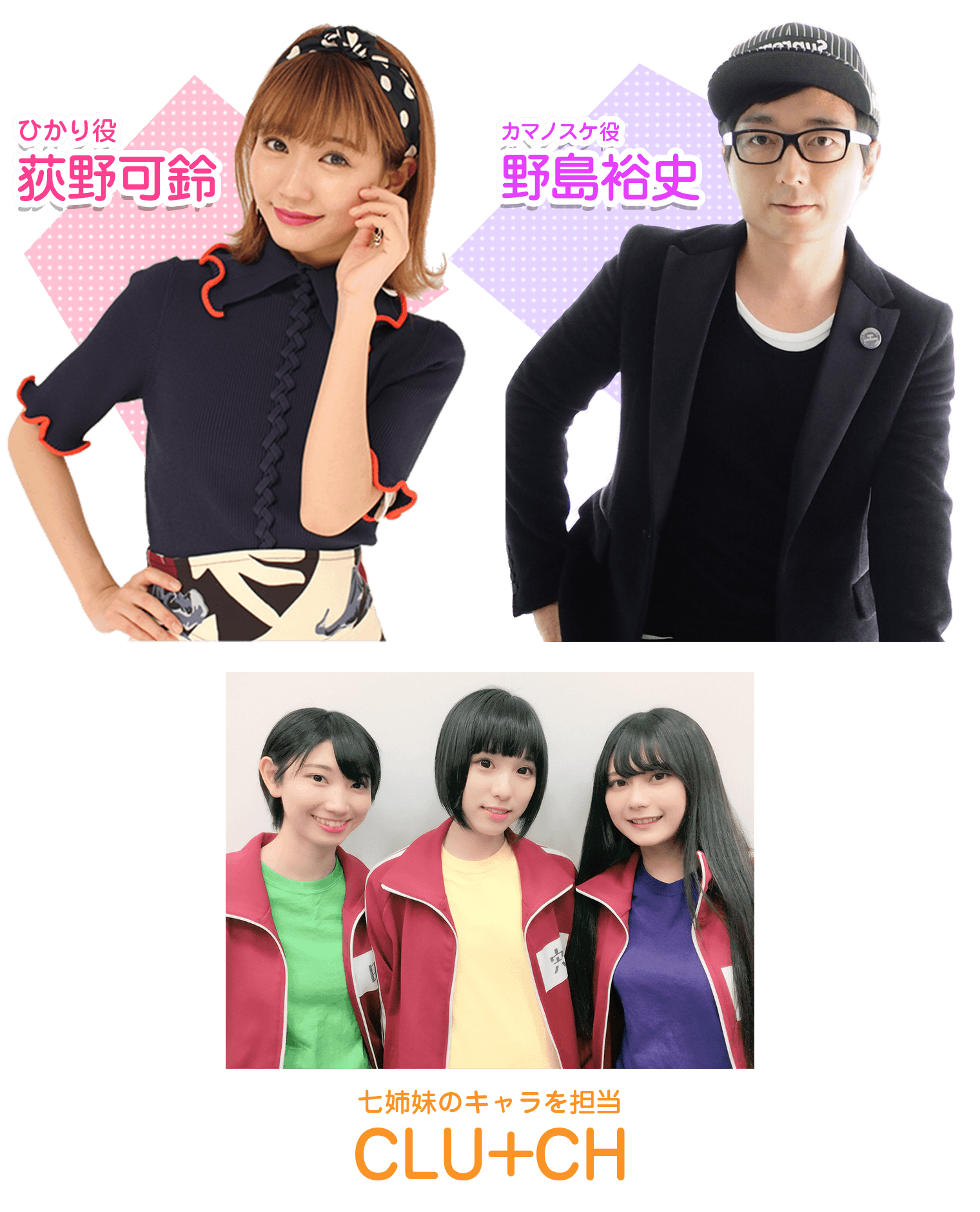 また、バトルの相手カマノスケ役は、「弱虫ペダル」でもおなじみの声優、野島裕史さん。そのほか、新人の声優アイドルユニット「CLU+CH(クラッチ)」も、町田美優さん、宍戸智恵さん、石原千尋さんの三人が、それぞれ七姉妹のキャラとして声を担当。