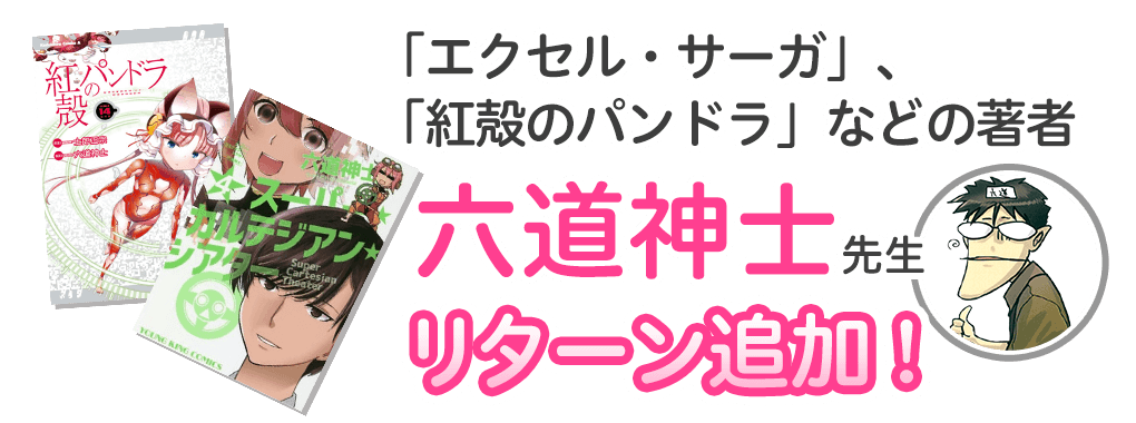 あの「エクセル・サーガ」(既刊27巻)はじめ、士郎正宗先生とコンビを組んだ「紅殻のパンドラ」(既刊14巻)、話題作「スーパー・カルテジアン・シアター」(既刊4巻)を執筆されている六道神士先生から、こめかみっ!ガールズプロジェクトに応援として直筆イラストのサイン入り色紙やTシャツのお話を頂きました!