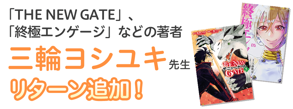 アルファポリス連載中の「THE NEW GATE」はじめ、少年ジャンプ+で人気を博した「終極エンゲージ」などで活躍されておられる三輪ヨシユキ先生から応援していただけることになりました!
