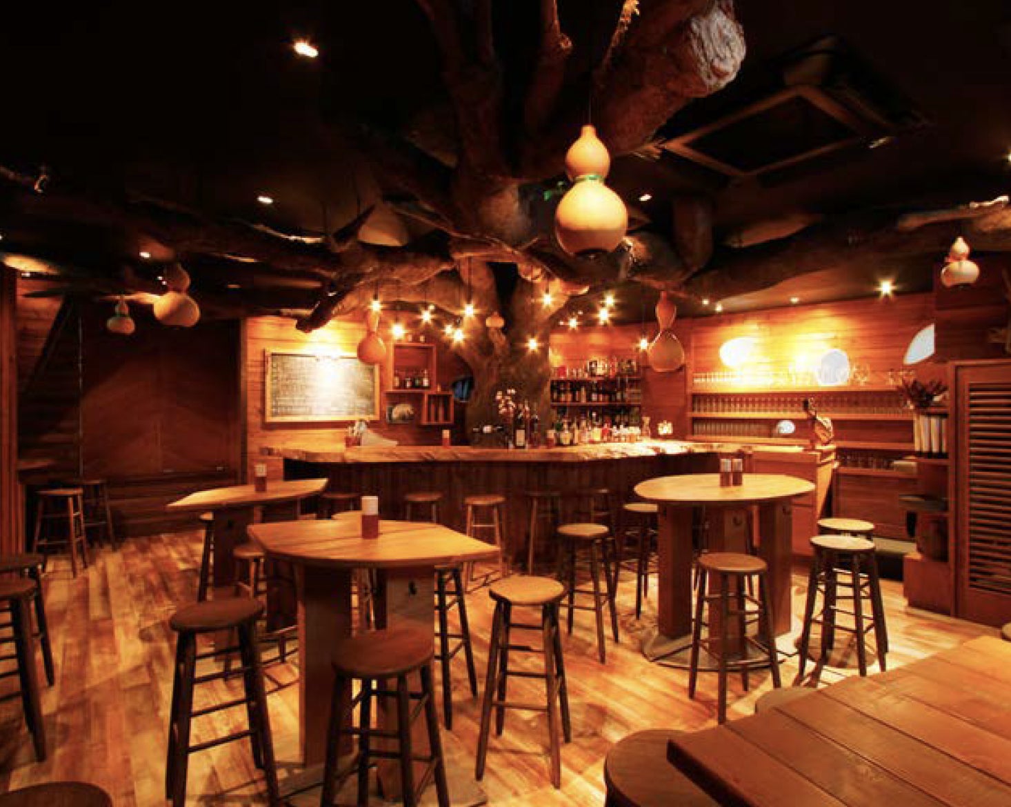木の幹にぽっかり空いた穴のようなエントランスを抜けて階段を上がると、そこには“ツリーハウス”のような非日常空間が広がっています。