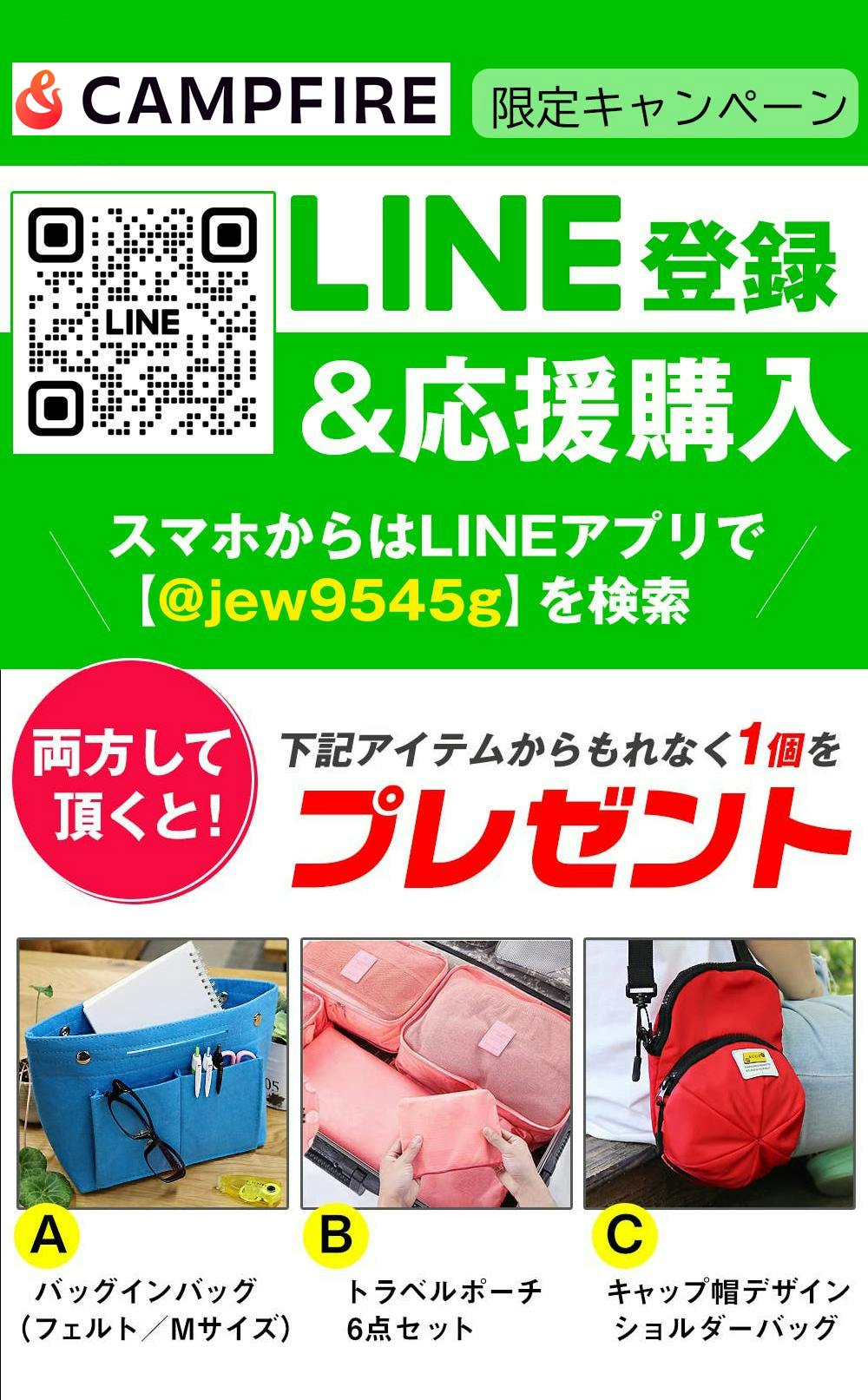 公式LINEにご登録 + 応援購入をいただいた方全員に、もれなくA~Cの内1個を無料プレゼント!