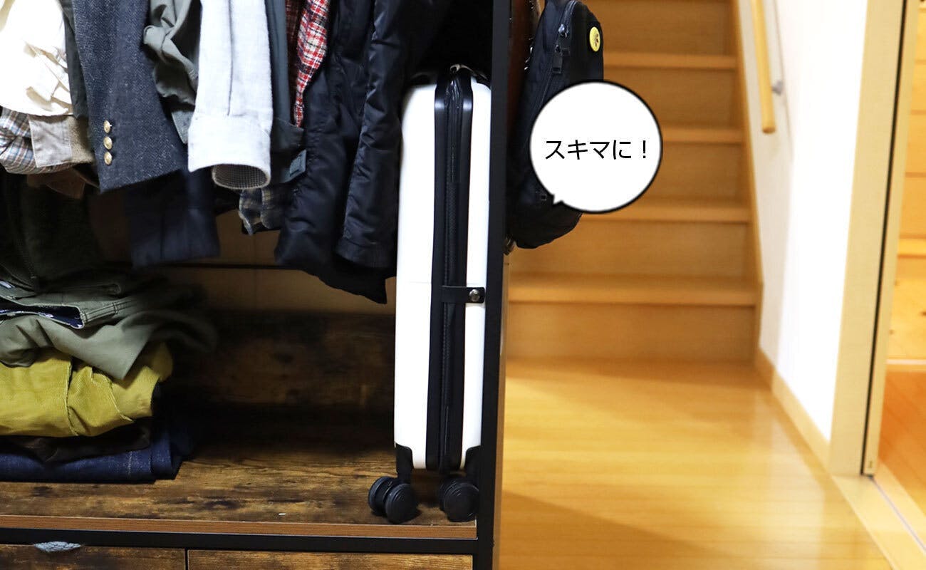 大体Mサイズ(24インチ)くらいのスーツケースなら片側にスッポリ収まるスリムさだから、