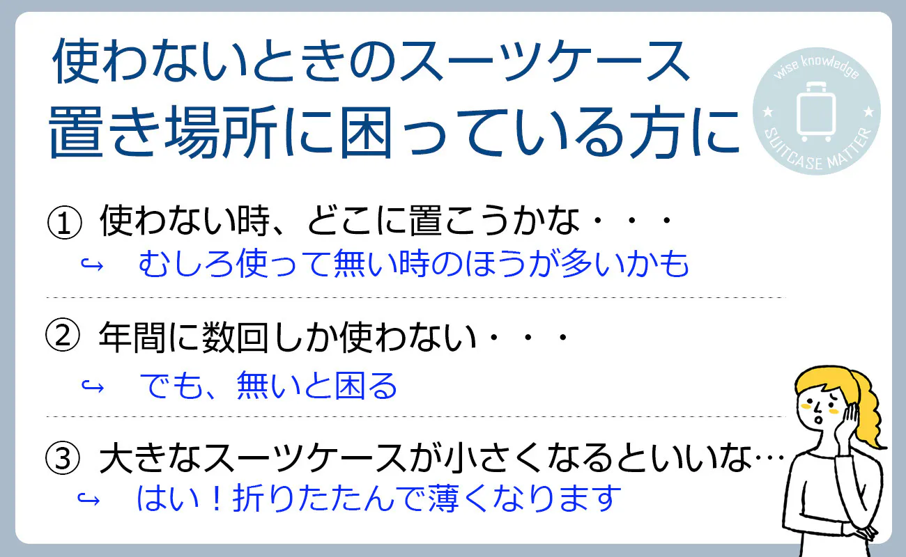 旅行や出張で活躍するスーツケース。長年製造販売を続ける中で、お客様から最も多く寄せられた声のひとつが「使わない時の収納場所」という悩みでした。せっかく便利なアイテムも、使わないときには収納場所に困るという現実がありました。