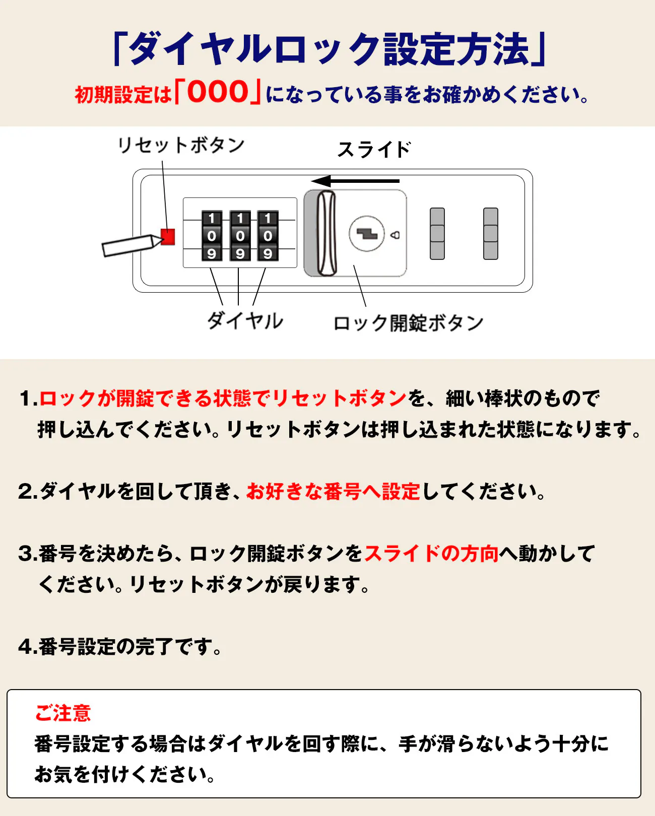 セキュリティ面には、シンプルで扱いやすい 3桁のダイヤルロックを搭載。