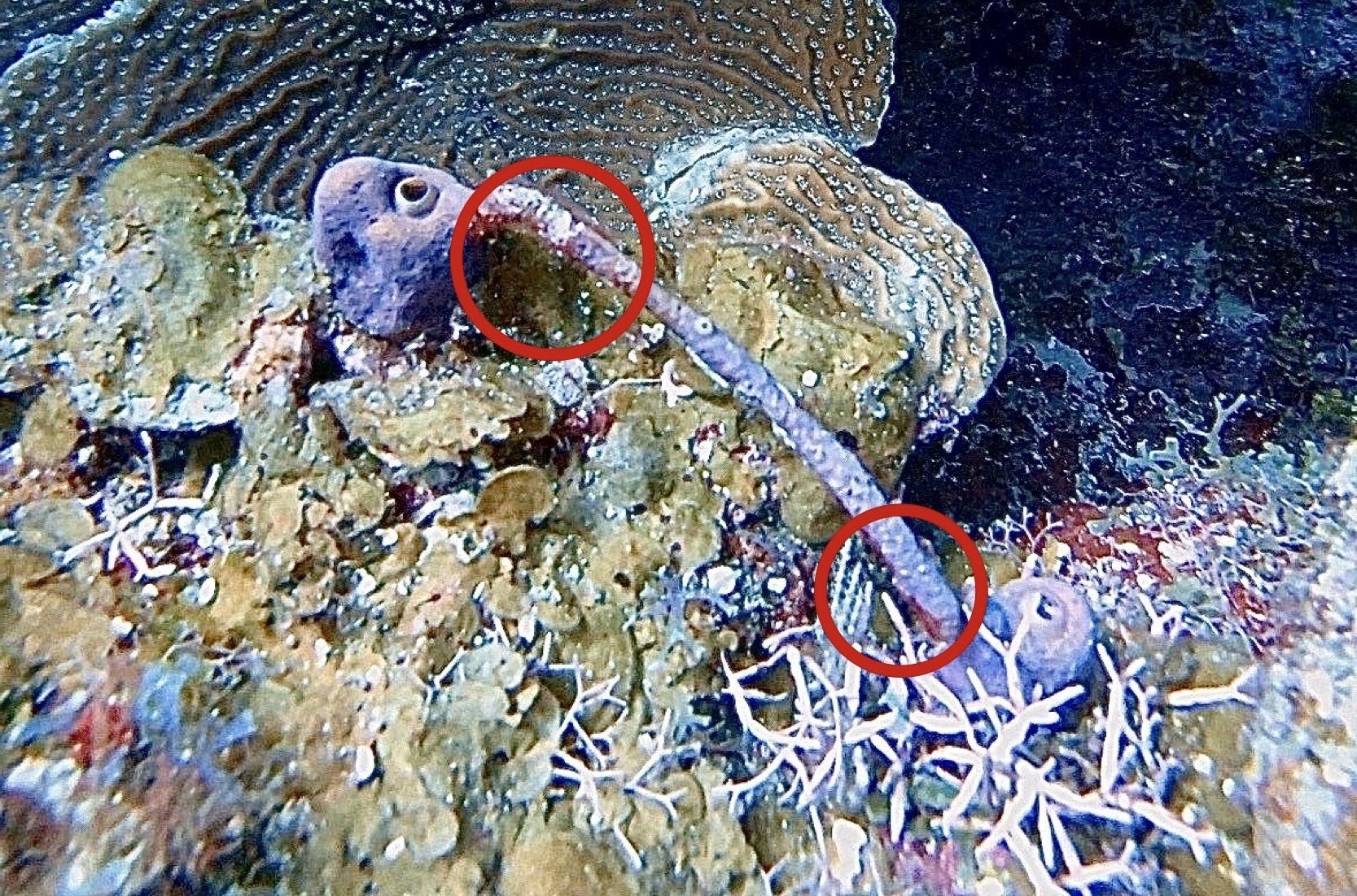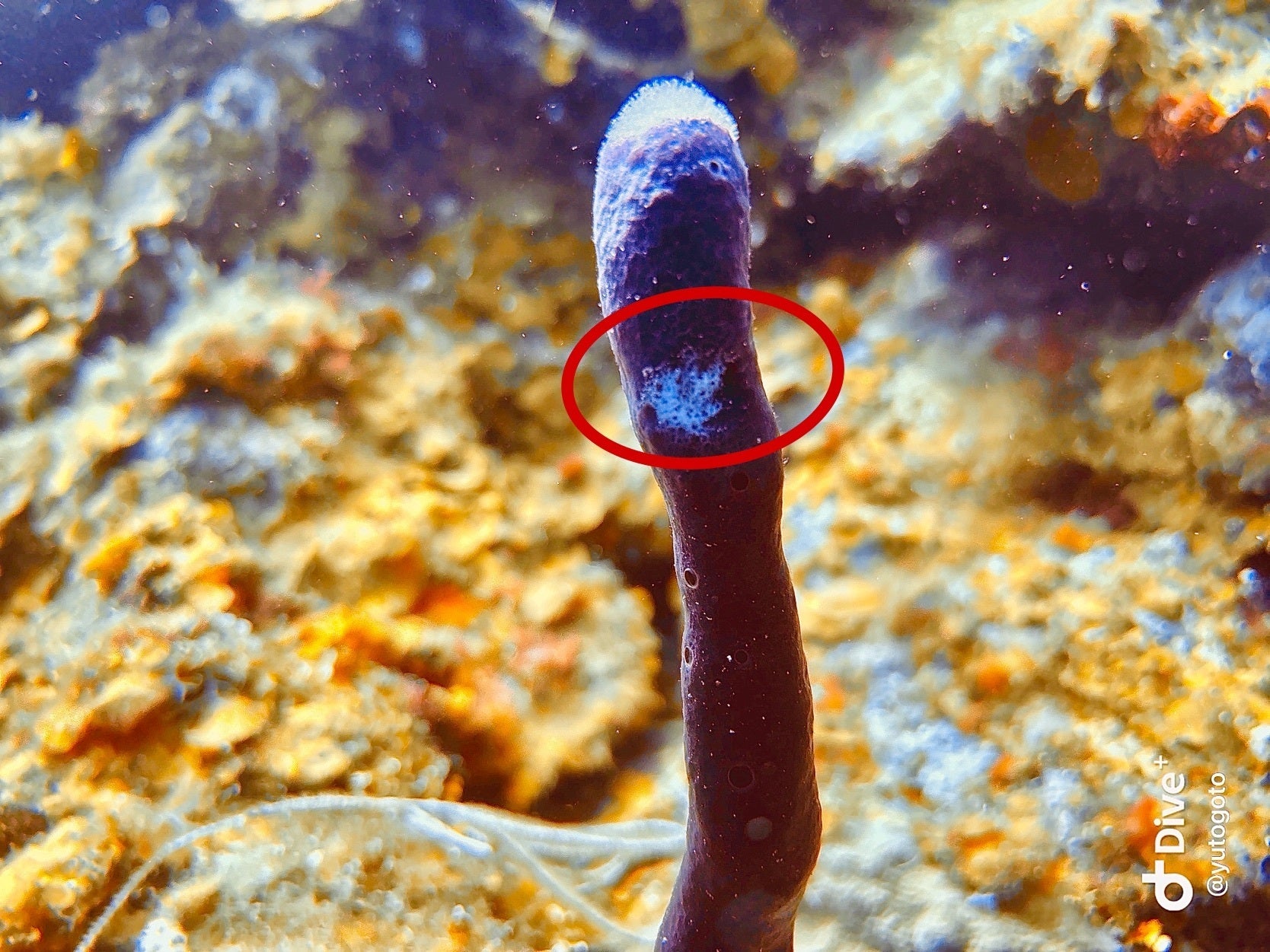 近年、ロアタン島のサンゴ礁ではスポンジに 赤帯病(Aplysina Red Band Syndrome: ARBS)や白斑病(Sponge White Patch Disease: SWPD) といった病気が確認され始めています。これらの病気はスポンジの組織を破壊し、やがて死に至らせます。スポンジは海の水を濾過し、栄養を循環させ、多くの魚やサンゴの住処となる重要な存在です。そのため、スポンジの病気は「スポンジだけの問題」ではなく、サンゴ礁全体の健全性に影響を与える連鎖的な脅威となり得ます。