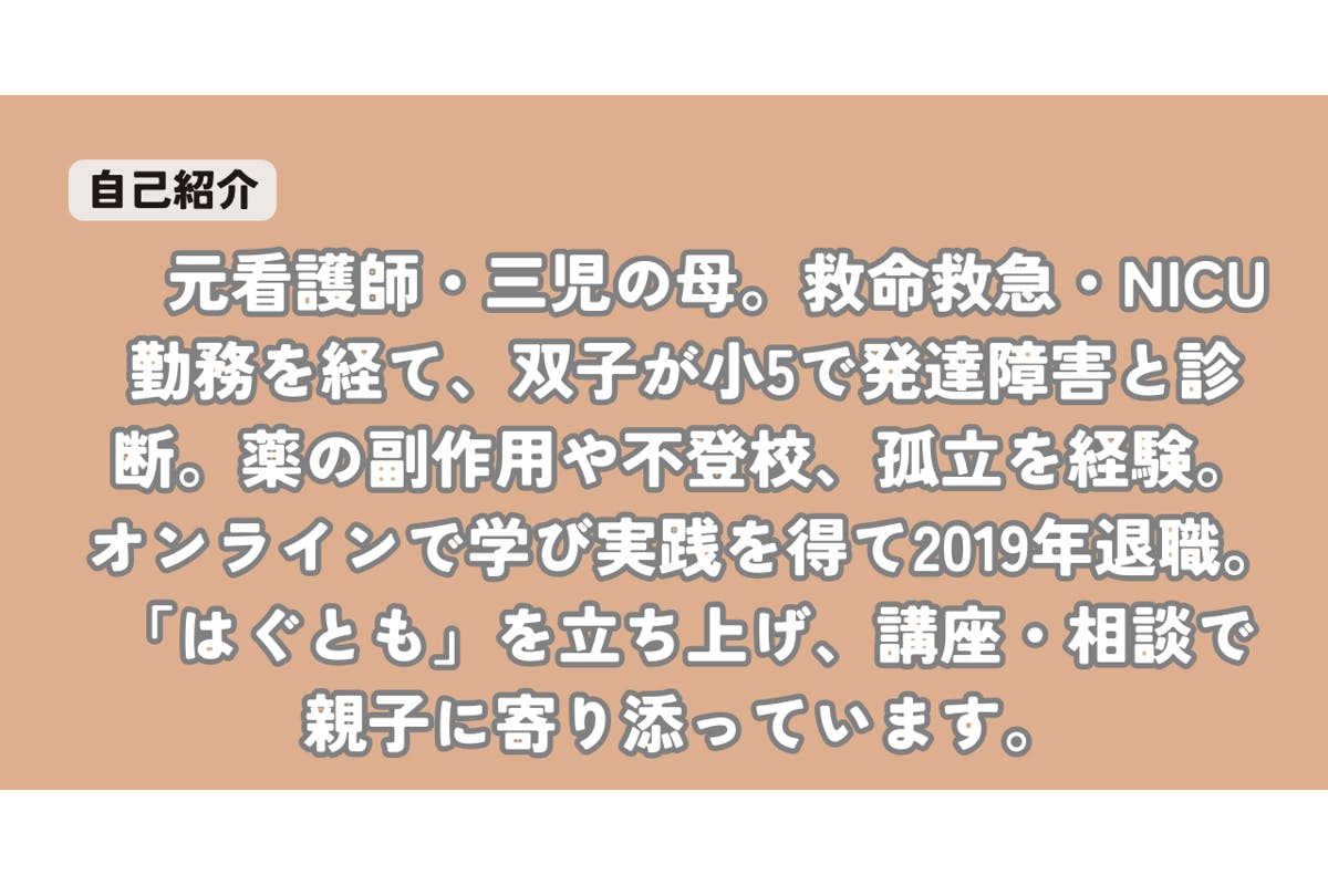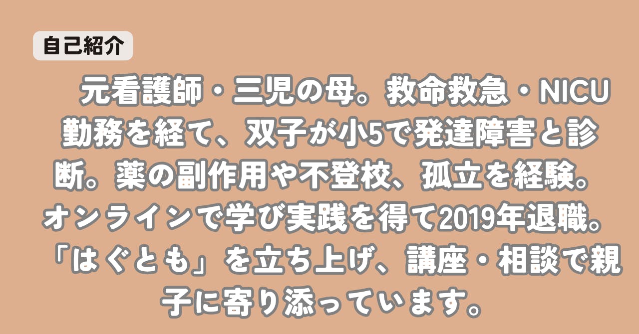 こういう経験から、発達障害を持つわが子との関わりはとても大変だと知っています。「発達障害のことを熟知はしなくていいからまず知ってほしい」という想いが強くなって、看護師をやりながら、発達障害について知ってもらうために関東から先生を招いて講演会を開催したり、教育の在りようを考える「みんなの学校」という映画の上映会をしたりしました。その時に、自分と同じように悩んでる親御さん、教育現場で悩んでいる先生たちと接し、きっと私のこの苦しみや、くやしさ、やらかしてしまった事をシェアすることで発達障害の当事者やその親を支援できるのではないかと思い、 看護師を辞め、「はぐとも」という活動を始めました。トレーニングや講座、個別相談など息子たちを育てる上で必要だったすべてを提供しています。