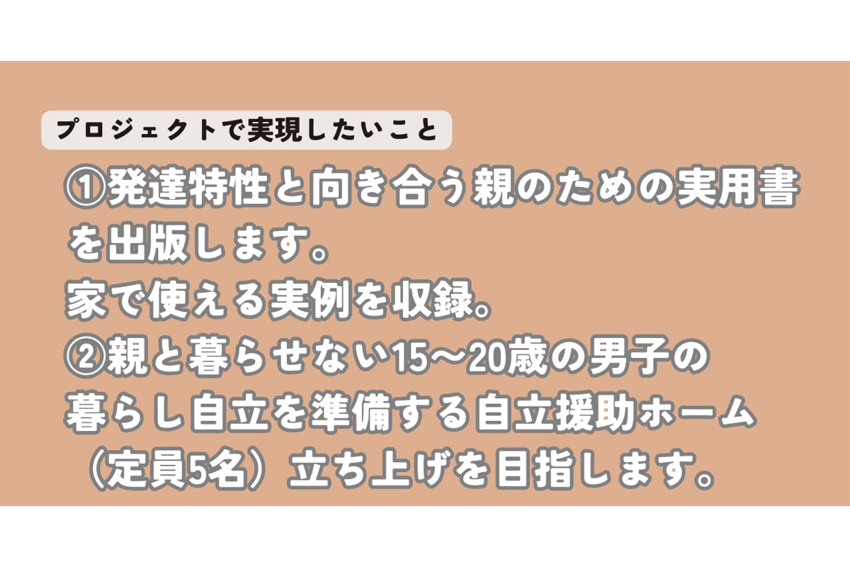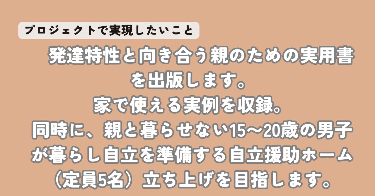 自立援助ホームは、15歳から20歳くらいの、親と暮らせない子が入所して、一緒に生活しながら社会に出る準備をする施設です。私が作りたいと思っているのは、男の子が入居する施設で、定員は5人を考えています。