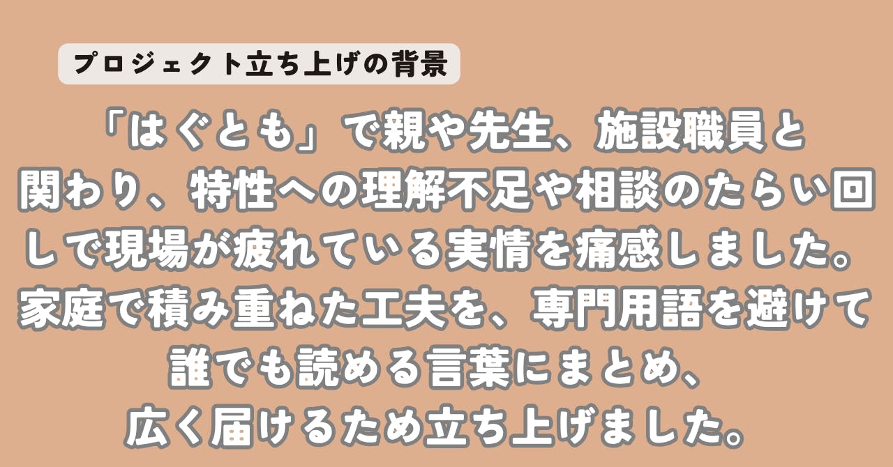 特性のある子たちを取り巻く生活環境にいる人たちに、発達障害に関する知識がない。知識を持ってもらえたら、子どもも関わる大人も、お互い楽になるのにと感じることが多々ありました。