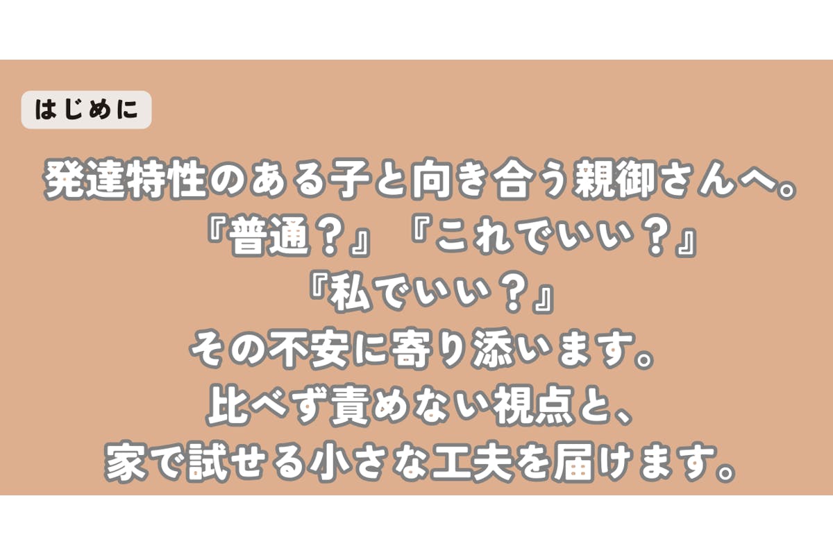 発達障害や、特性のある子の子育てにおいては、知識は重要ですが、知識だけですべてがうまくいくわけではないのが生活です。私のこれまでの経験から「こういうやり方がある」「こういう考え方もある」ということを伝え、「こんなんでも大丈夫なんだ」とホッとしてもらえるような本にしたいと思っています。
