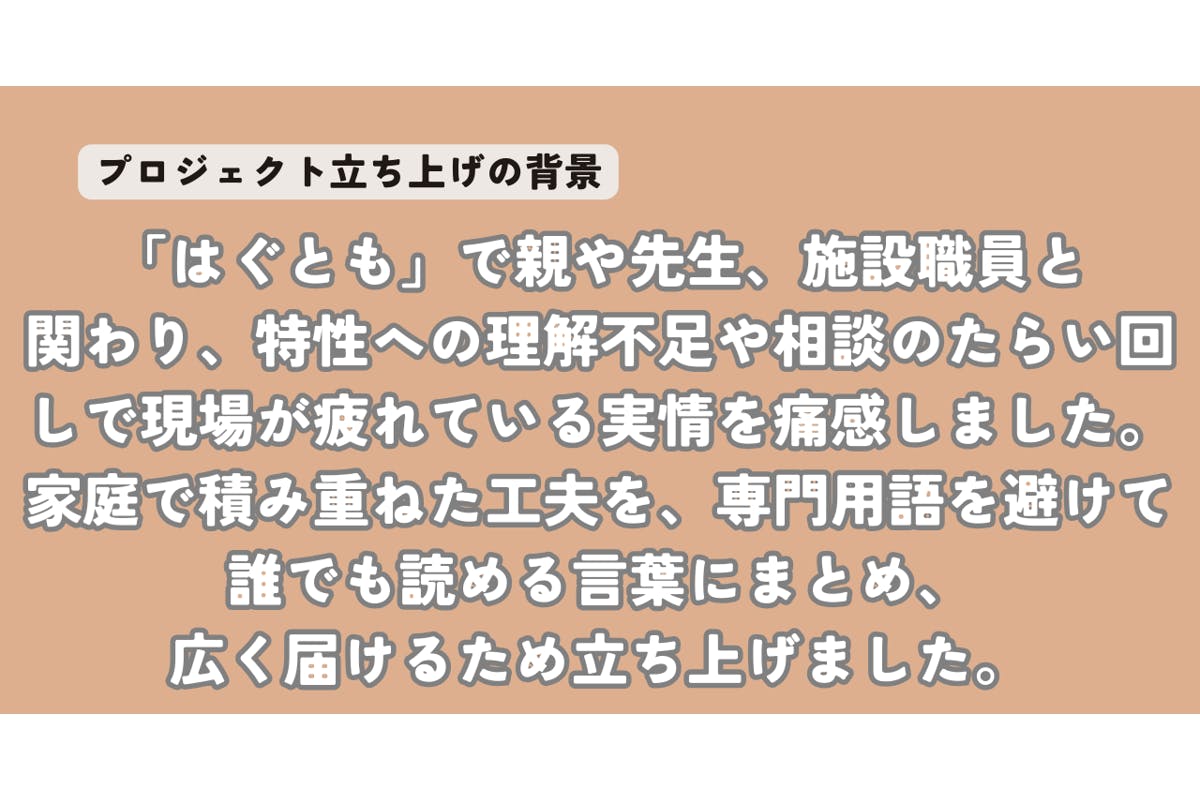 発達に課題のあるわが子の子育てが大変。そんな課題を持っているお母さんが、読んで気が楽になる本を届けたいです。私自身の経験や、はぐともという支援活動を通じて出会ってきた当事者のみなさんとの交流から、今の私が感じ、学び、理解していることを一冊の書籍にまとめて届けていきたいのです。そのための資金に活用します。
