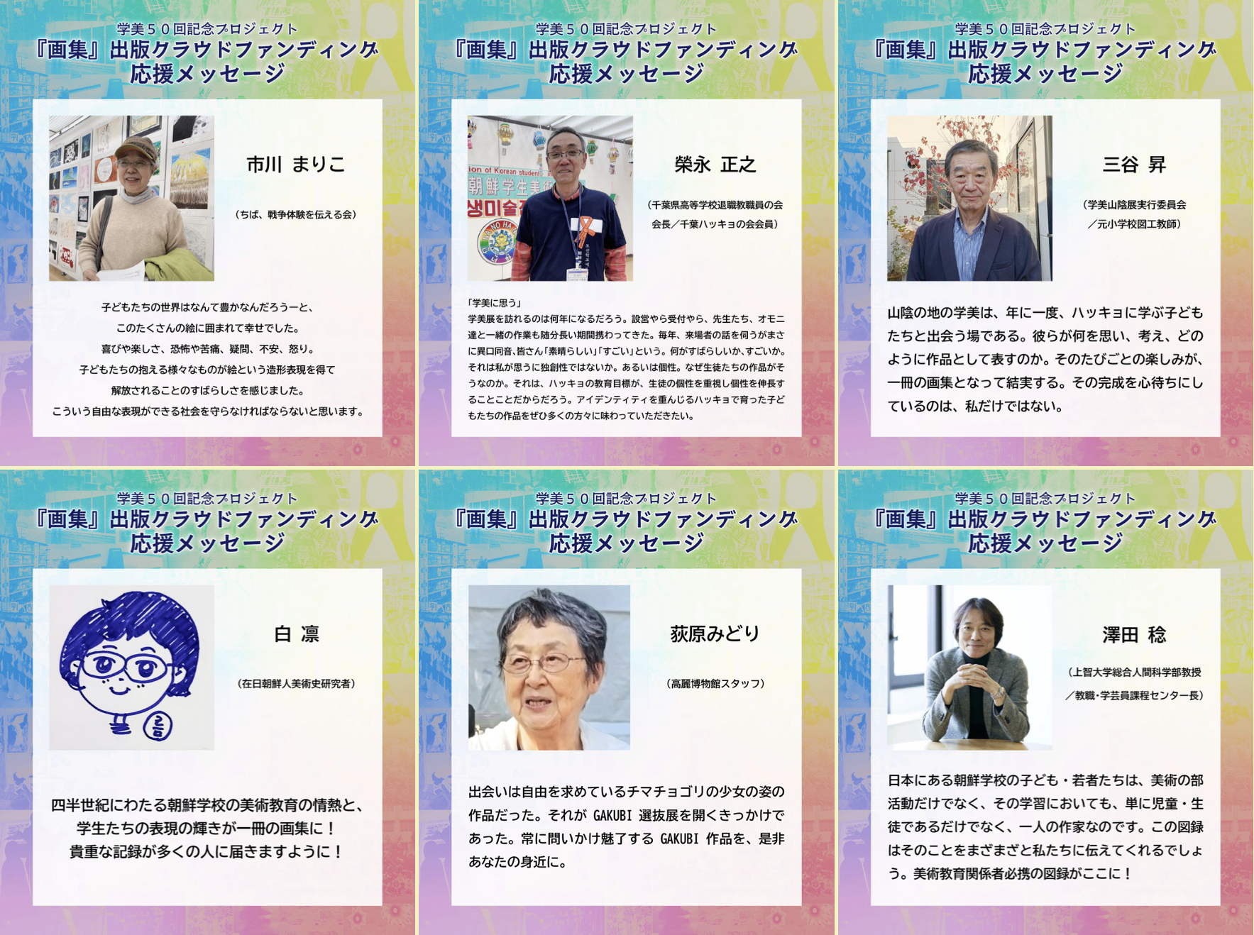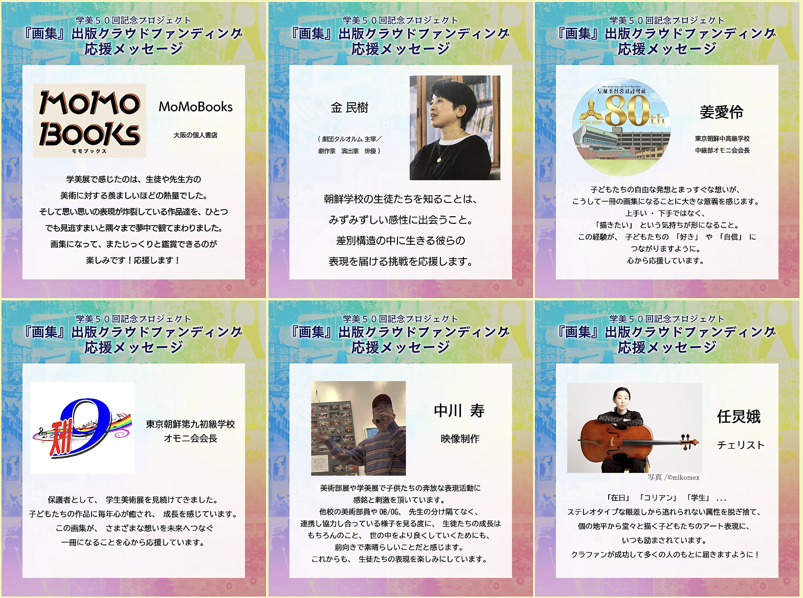 そして、出来上がった画集を一人でも多くの方々に広めることで、日本の地でウリハッキョに通う生徒たちの素晴らしい成長と、彼らの表現の価値を作品解説と共に感じていただけたら幸いです。