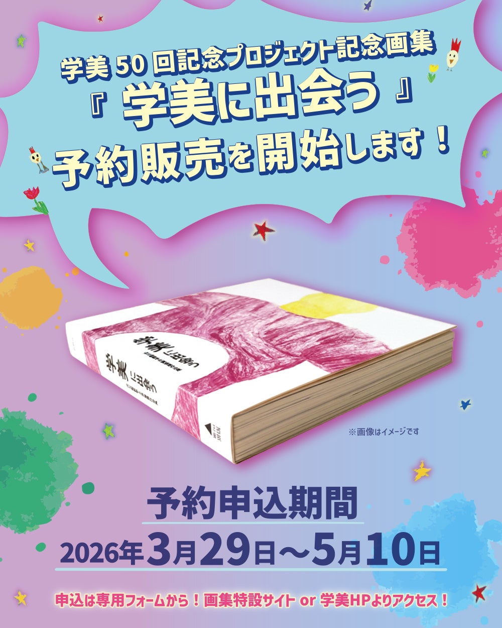 2026/03/31 12:00本プロジェクトを支援してくださっている皆さま、いつもありがとうございます。この度、画集『学美に出会う』の予約販売を開始する事となりましたので、お知らせします!クラウドファンディングが大成功したくさんの方々のご支援のおかげで、無事私たちの画集は完成に近づいてきました。まだまだ制作作業は続きますが、一足先に予約販売を開始できることとなりました。クラウドファンディングのリターンで画集を選んだけど追加で手に入れたい!クラファンが終わって知ったから注文を逃してしまった!という方など、購入希望の方は、以下の専用フォームから申し込みください。たくさんのご予約お待ちしております!ぜひ、周囲の方々にもシェア&ご周知いただければ幸いです♪⋆ ✩ ⋆ ┄ ⋆ ✩ ⋆ ┄ ⋆ ✩ ⋆ ┄ ⋆ ✩ ⋆ ┄ ⋆ ✩ ⋆ ┄ ⋆ ✩ ⋆⬛︎ 画集予約販売申し込みフォーム ⬛︎https://forms.gle/k8FBFteD9v8bXcfH7予約申し込み期間:2026年3月29日〜5月10日お届け時期:2026年8月下旬〜9月上旬を予定※その他詳細はリンク先をご覧ください。⋆ ✩ ⋆ ┄ ⋆ ✩ ⋆ ┄ ⋆ ✩ ⋆ ┄ ⋆ ✩ ⋆ ┄ ⋆ ✩ ⋆ ┄ ⋆ ✩ ⋆ みなさまの継続した応援や関心を寄せてくださることが、私たちの活動の大きな力になっています。引き続き、学美のプロジェクトにご注目よろしくお願いします! もっと見る