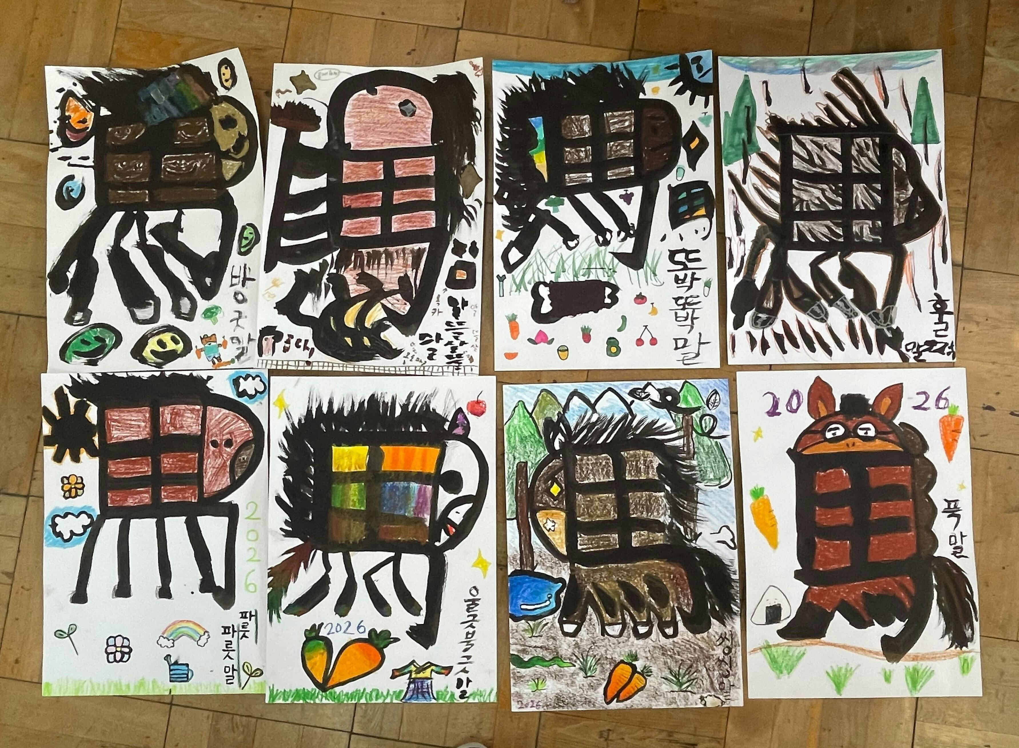 朝鮮語のオノマトペ学習と書道を組み合わせ、 「新年の決意」を表す馬を創作。 《쭉(じっくり)》や《알뜰살뜰(まめまめしく)》など、決意に合わせたユニークな馬が誕生しました!