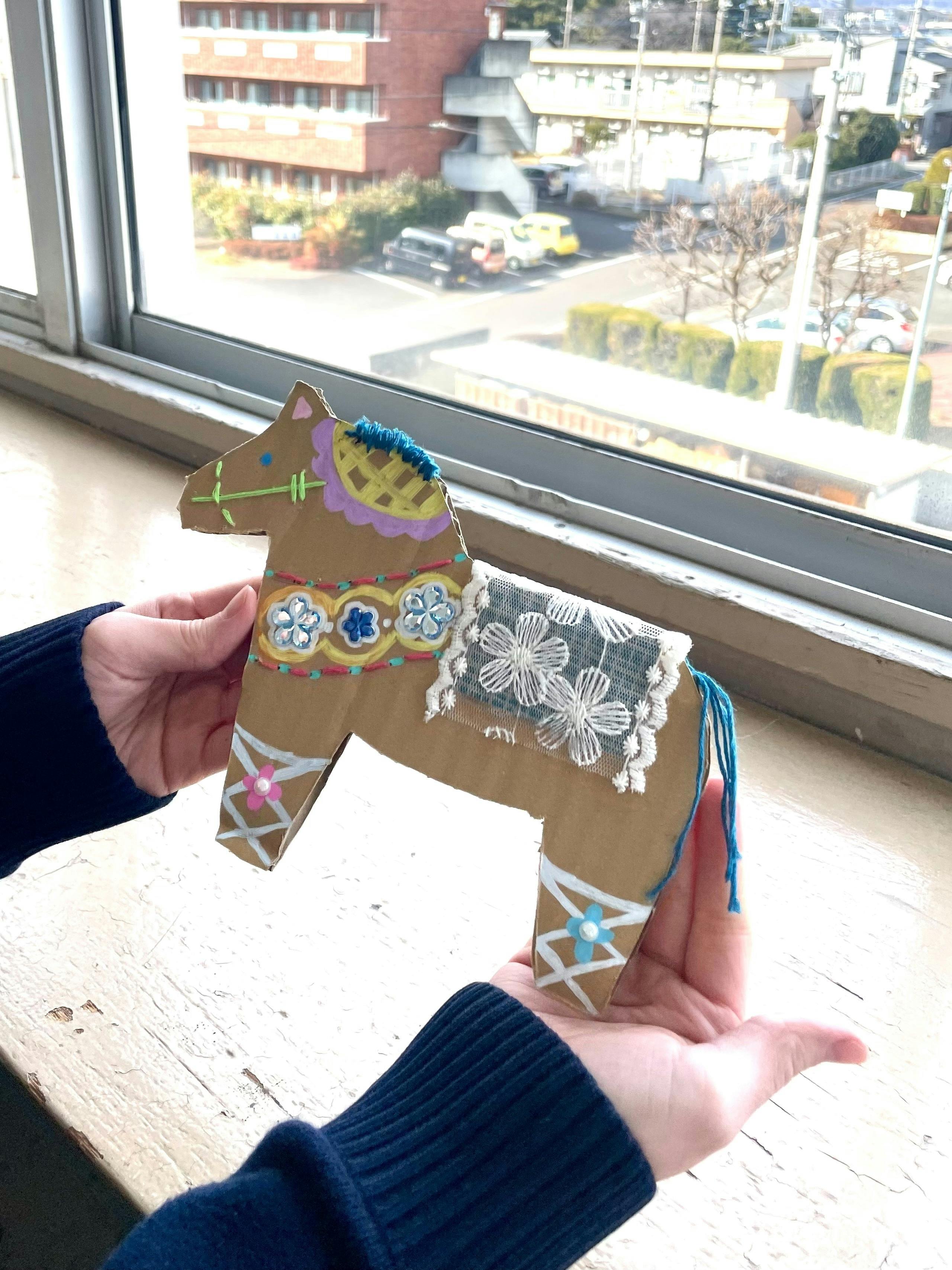 中級部は、スウェーデンの伝統工芸・ダーラナホースをテーマに制作しました。 本来は木彫りの飾りですが、今回はダンボールに刺繍をしたり、線や花の模様を描いたりしてオリジナルの装飾に挑戦。
