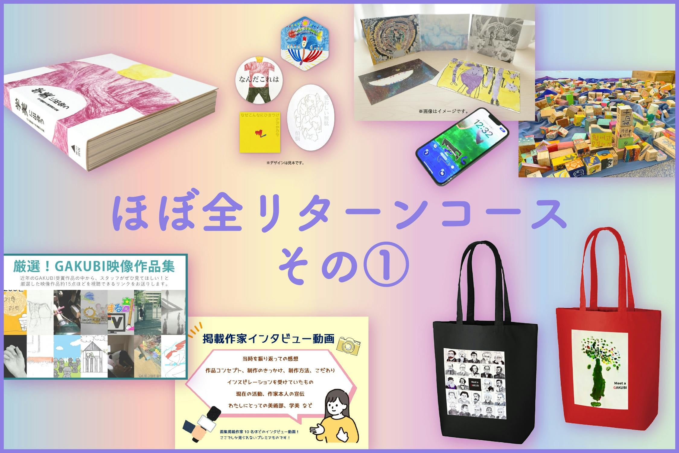 「ほぼ全リターンコース」は、今回のクラファンのオリジナルグッズと特別リターンたちが、ほぼ網羅できる内容となっております。その②は「美術部福袋セット付き」になります。