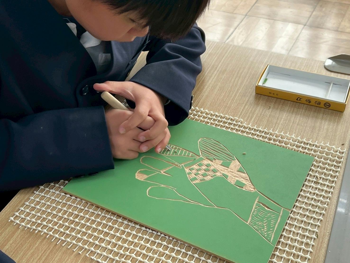 4年生は、初めての木版画に取り組みます。好きな形を描き、さまざまな模様を彫っていきます。慣れない彫刻刀に「めっちゃ難しい…」とため息をついたり、「きもちいい〜〜」と板を彫る感触を楽しんだり。