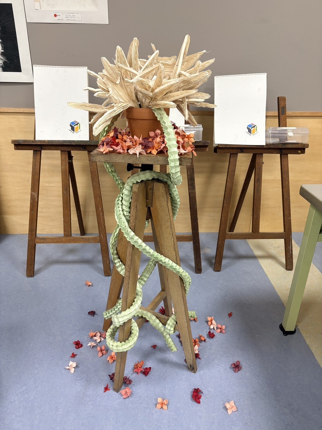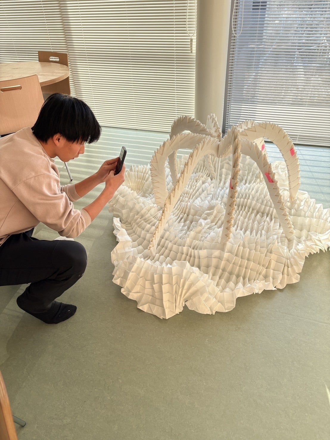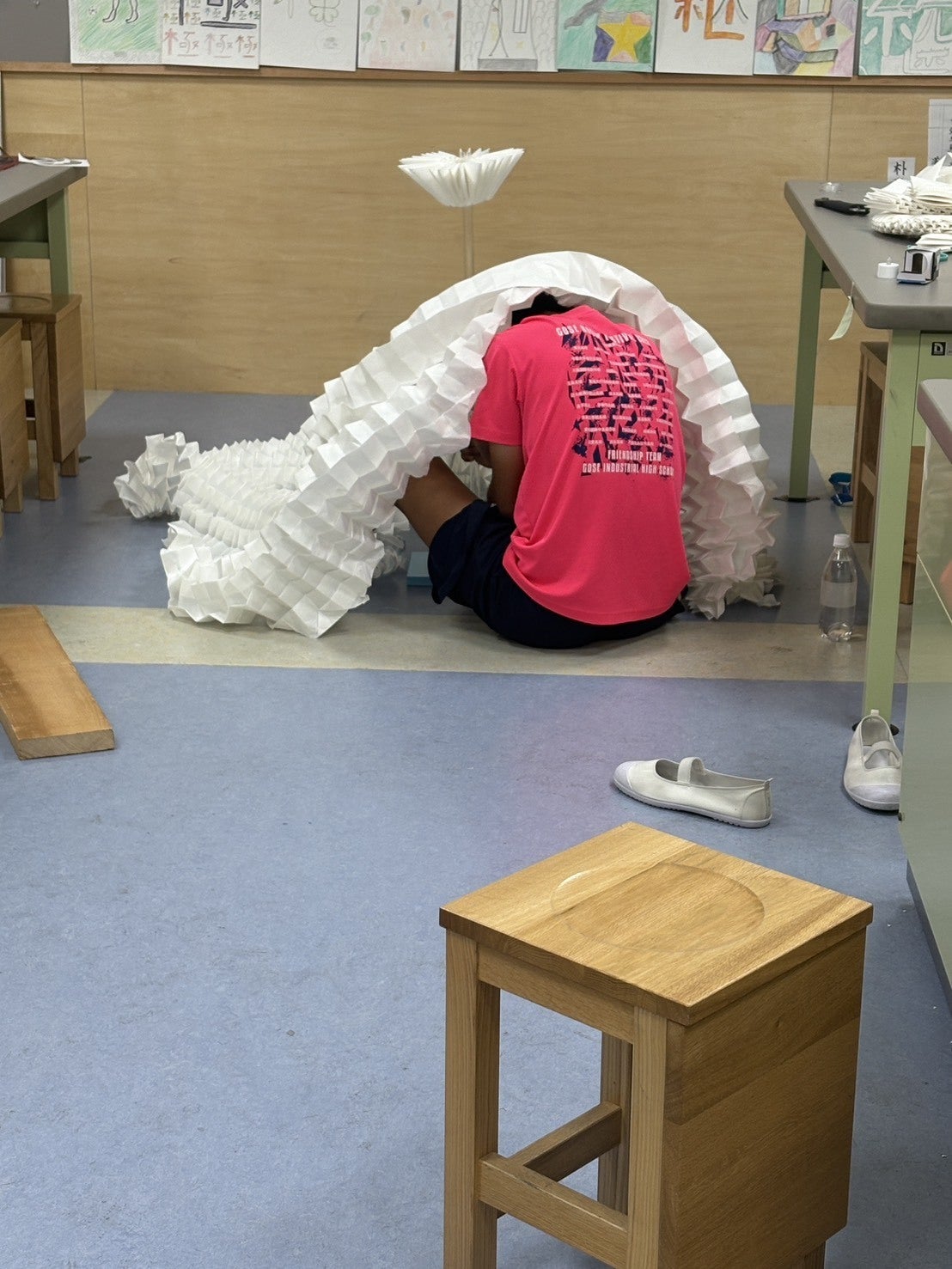 制作の過程では、紙の折りによる強度や構造を確かめながら、実際に作品の中に入り込むなど、身体を使って空間との関係を探る姿が見られました。思うように形が定まらない場面でも、壊しては組み直すことを繰り返し、試行錯誤を通して表現を深めていきました。