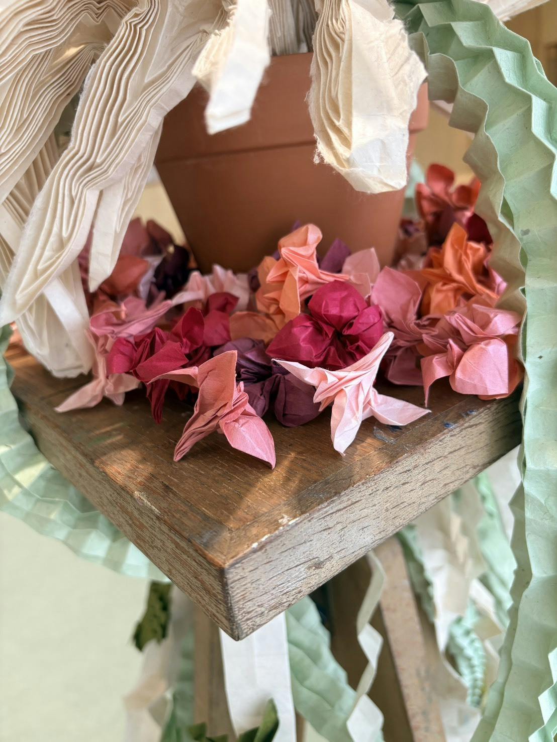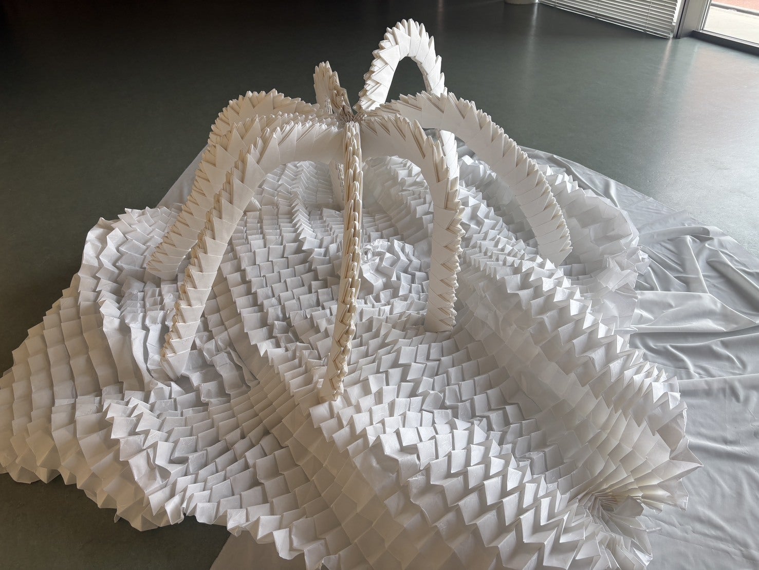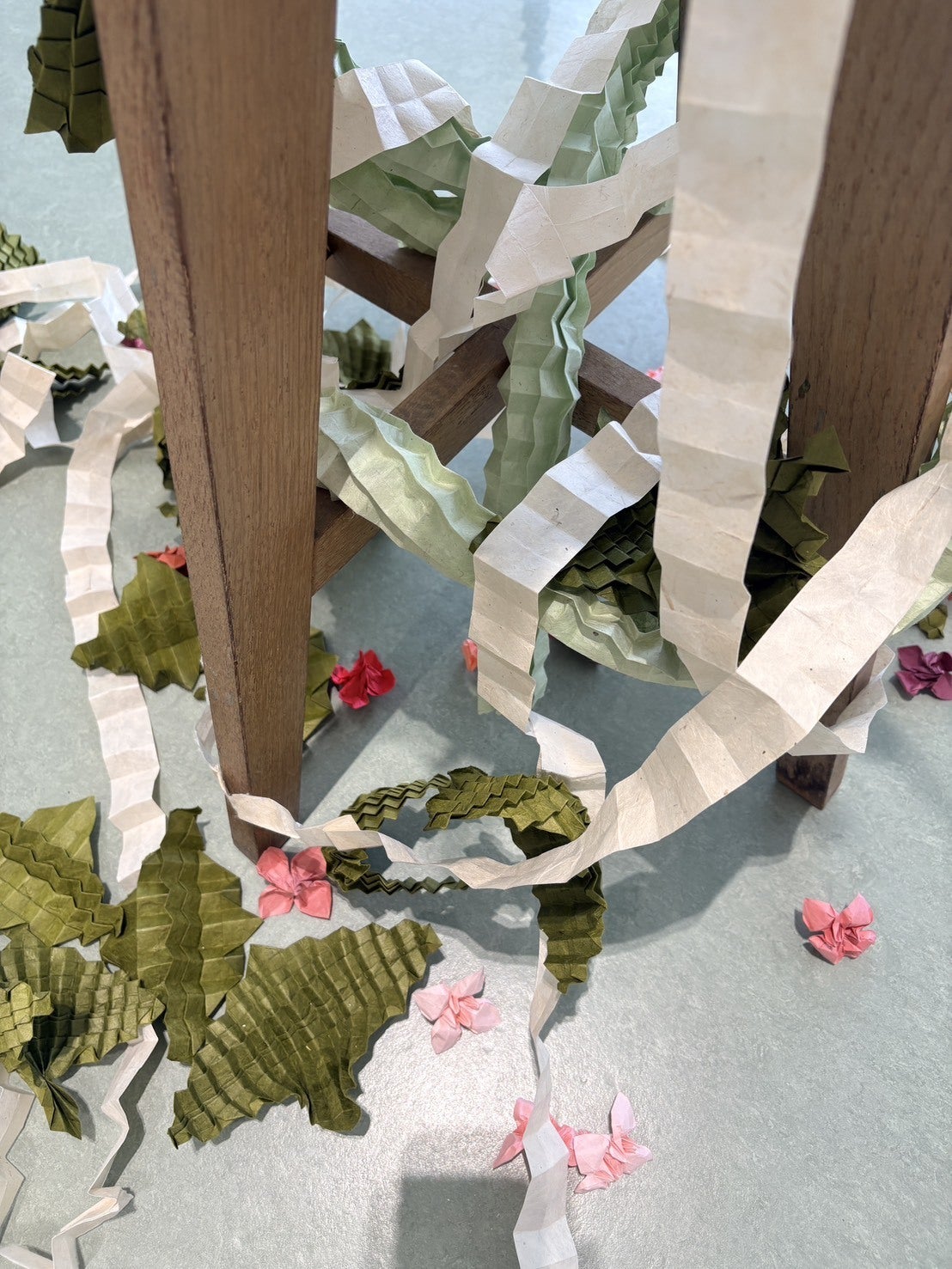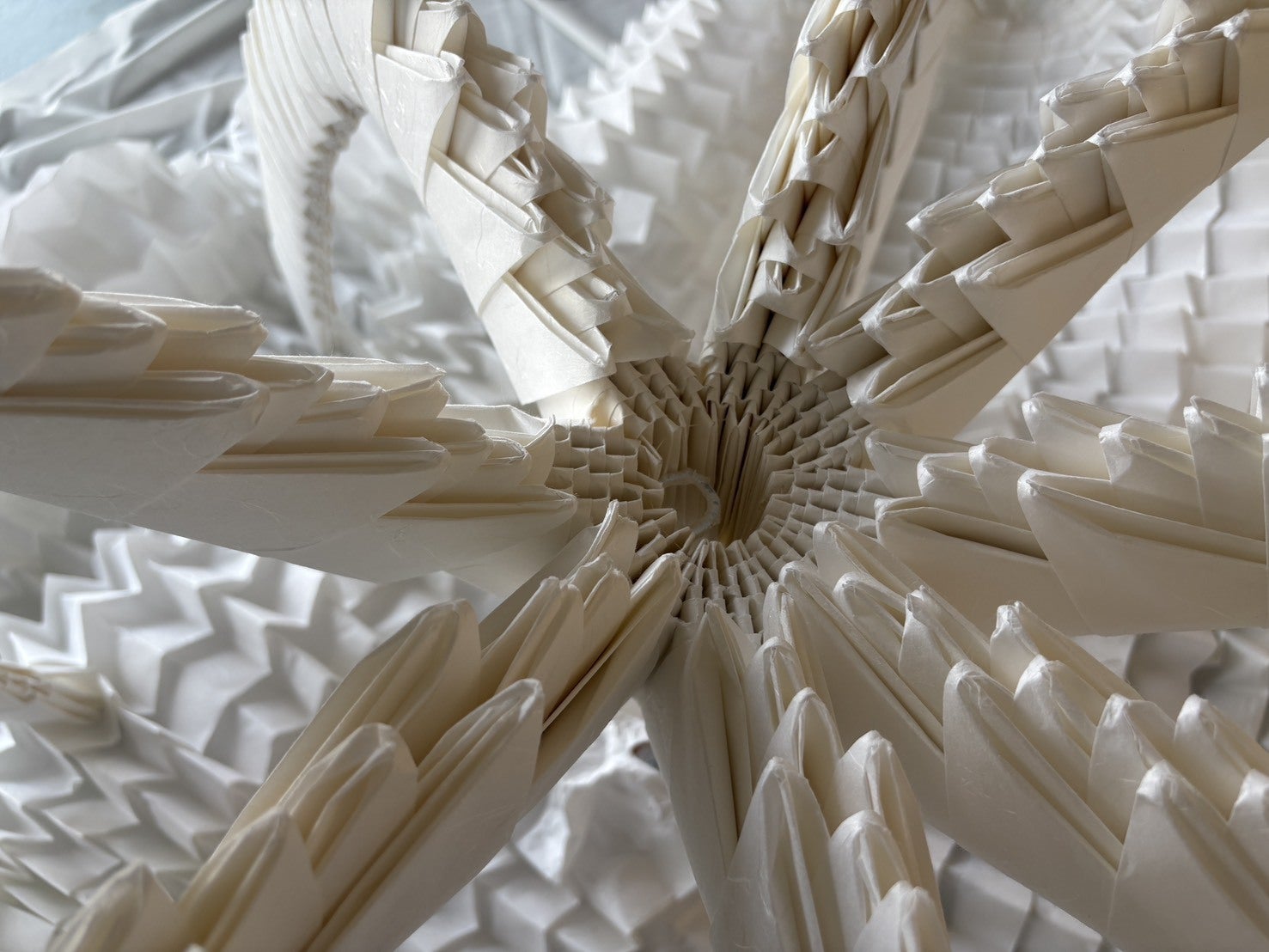 小さな折りの集積を大きなスケールへと展開することで、紙の軽さや重なり、空間への広がりといった素材の特性を的確に引き出していました。