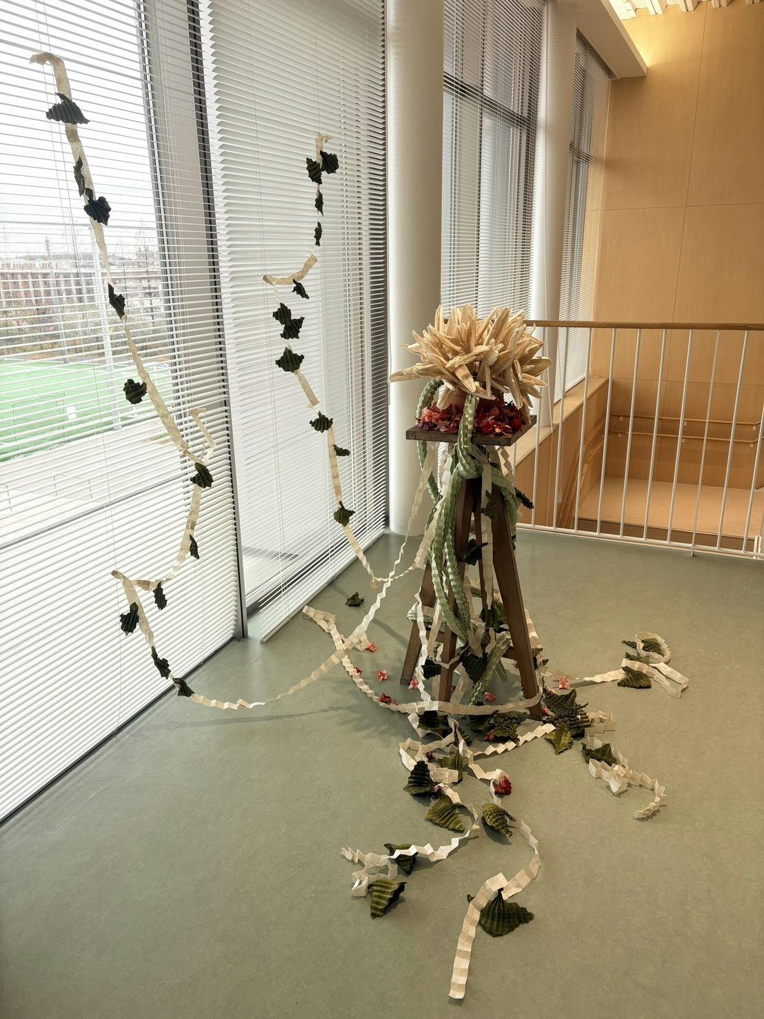同校高級部3年生の朴君は、幼少期から親しんできた折り紙の技術を、美術表現として空間作品へと発展させることに取り組んでいます。日常の中で身についていた「折る」「重ねる」という行為を造形要素として捉え直し、立体作品として構築することに挑戦しています。