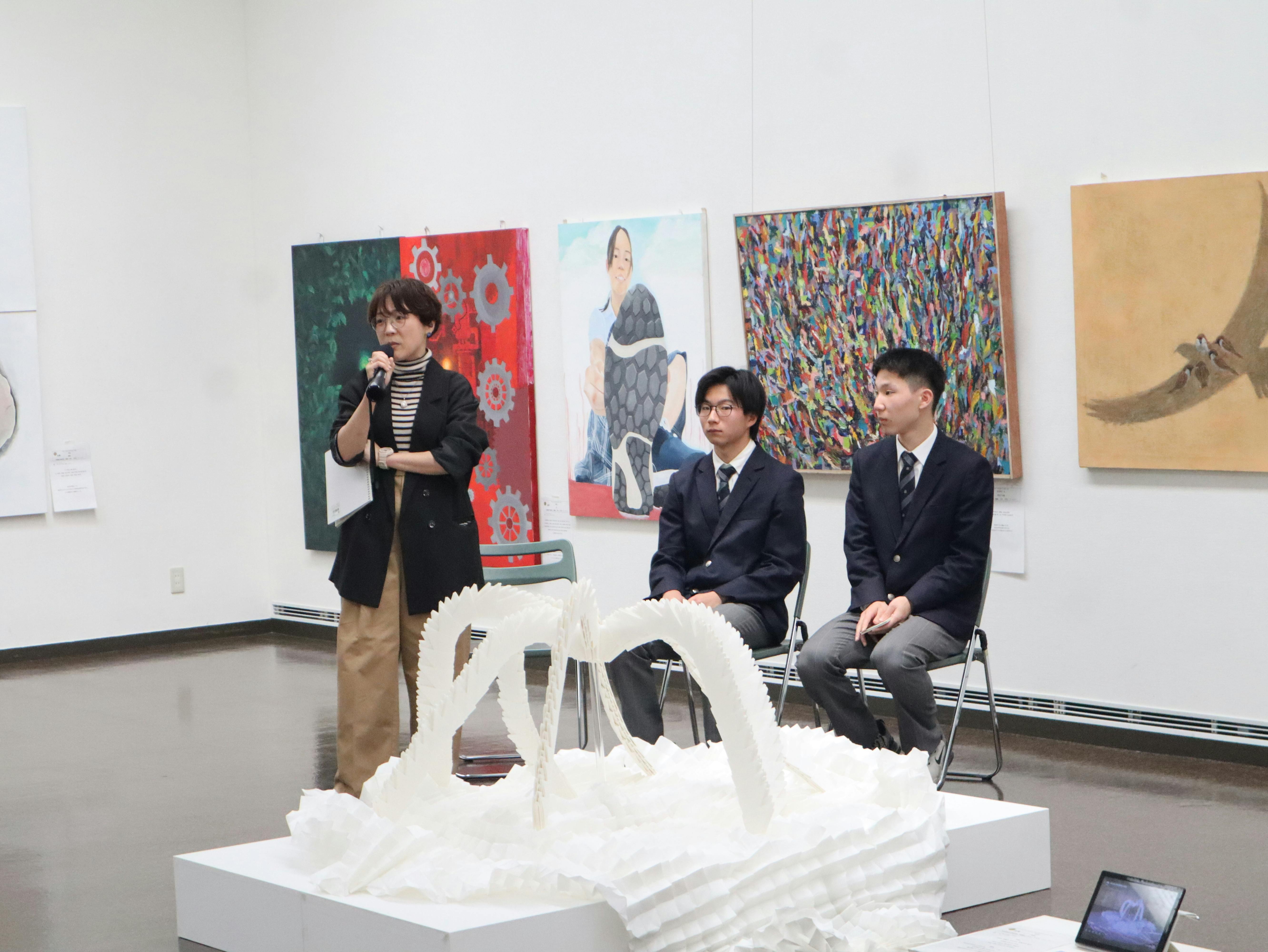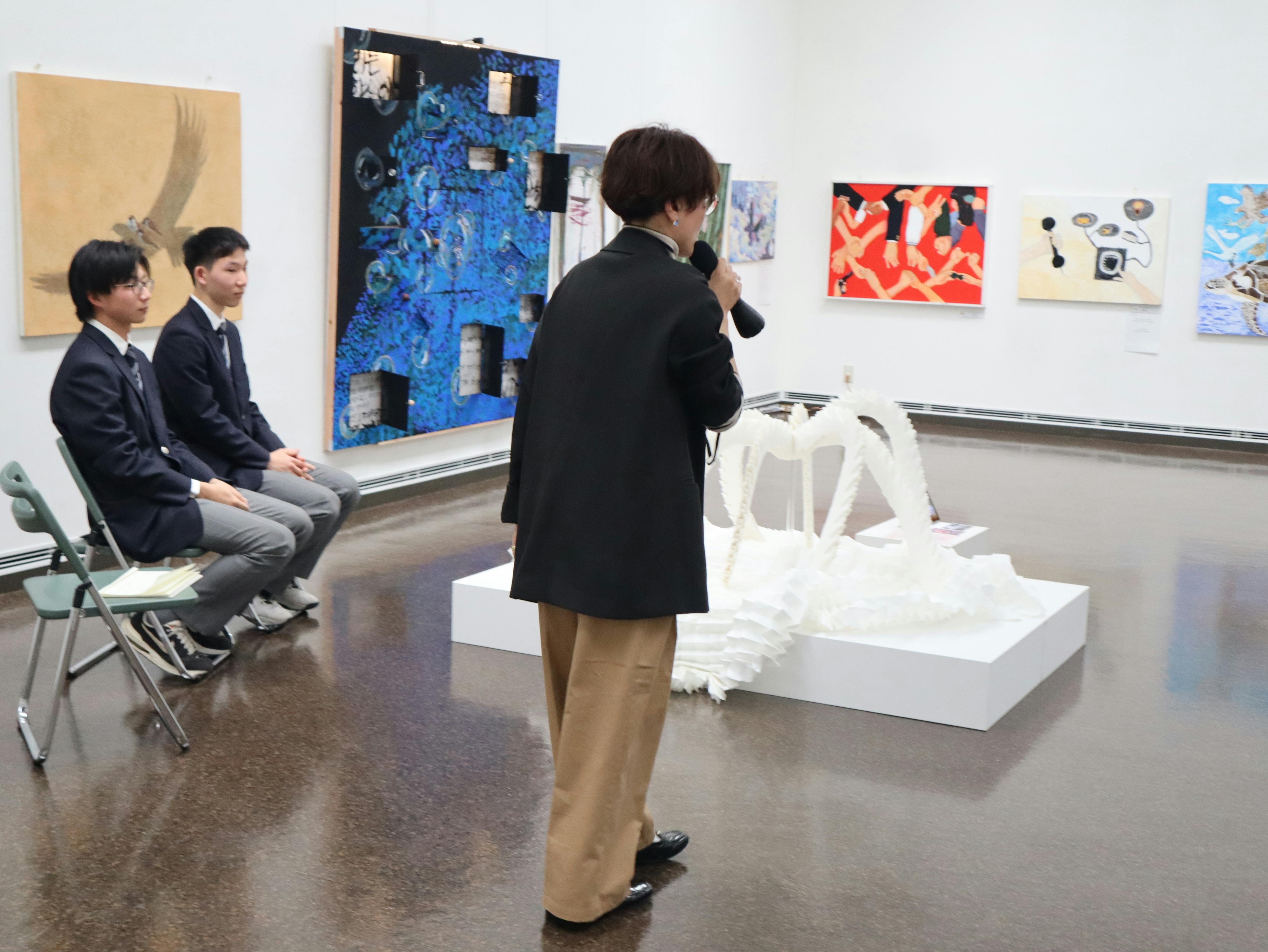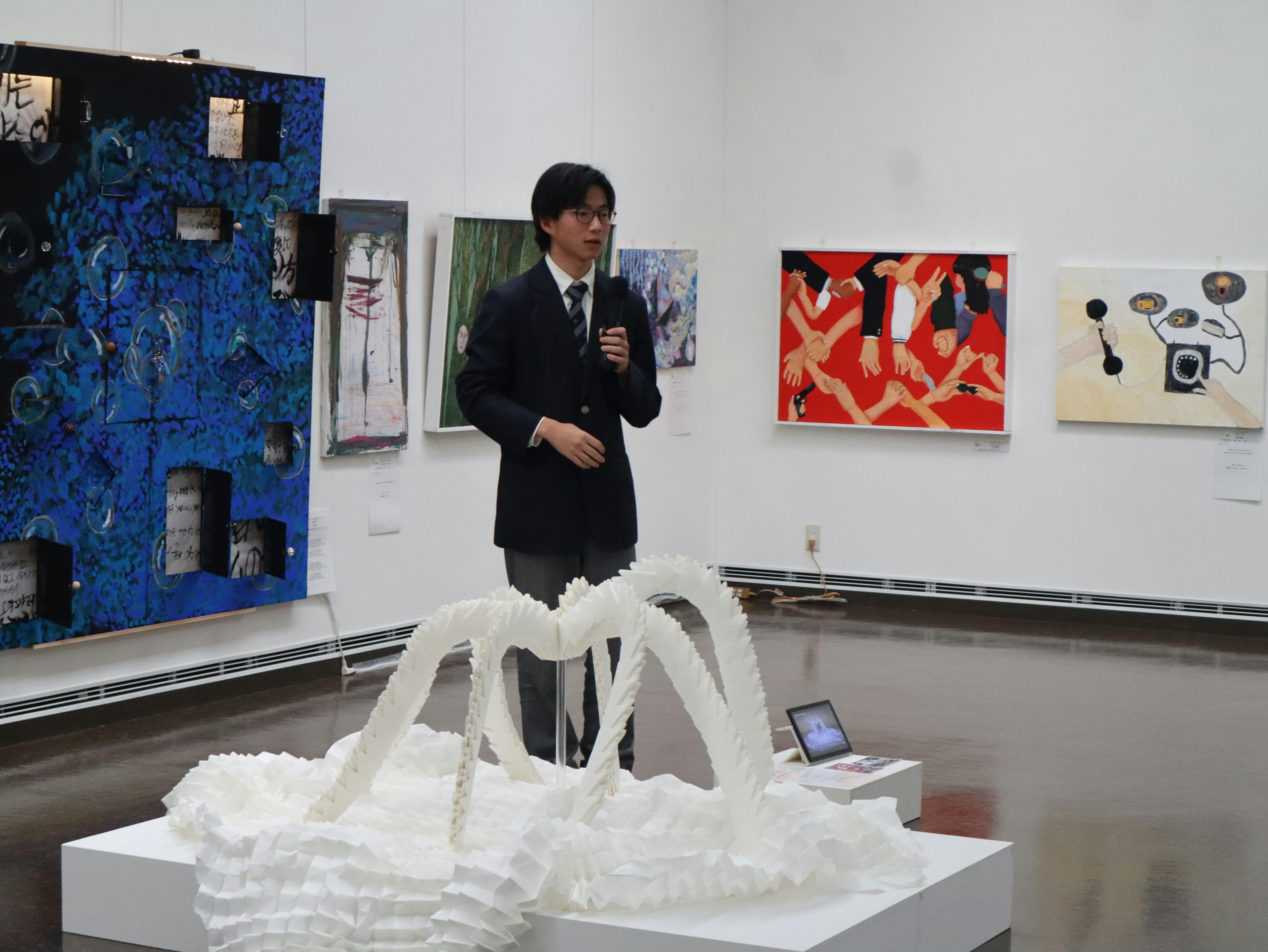 作品制作を通して試行錯誤を重ねてきたことや、表現することの難しさと面白さについて触れながら、大学進学後も引き続き美術を学び、自分の表現をさらに深めていきたいという抱負を来場者の前で語りました。