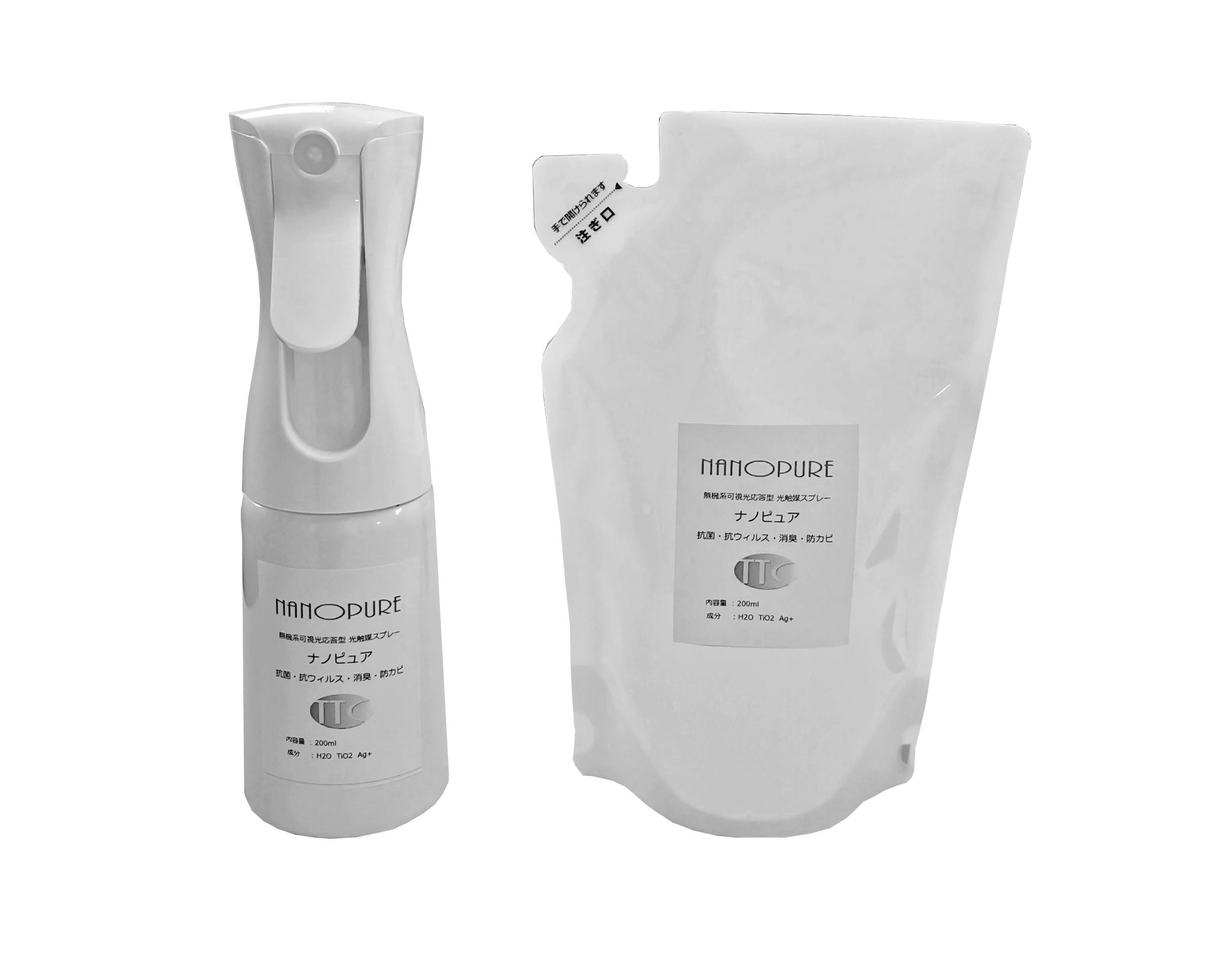 ナノピュアは、光触媒コーティング液/ナノマックスを9倍希釈し、ご家庭内で気軽に使用できるようした光触媒スプレーです。