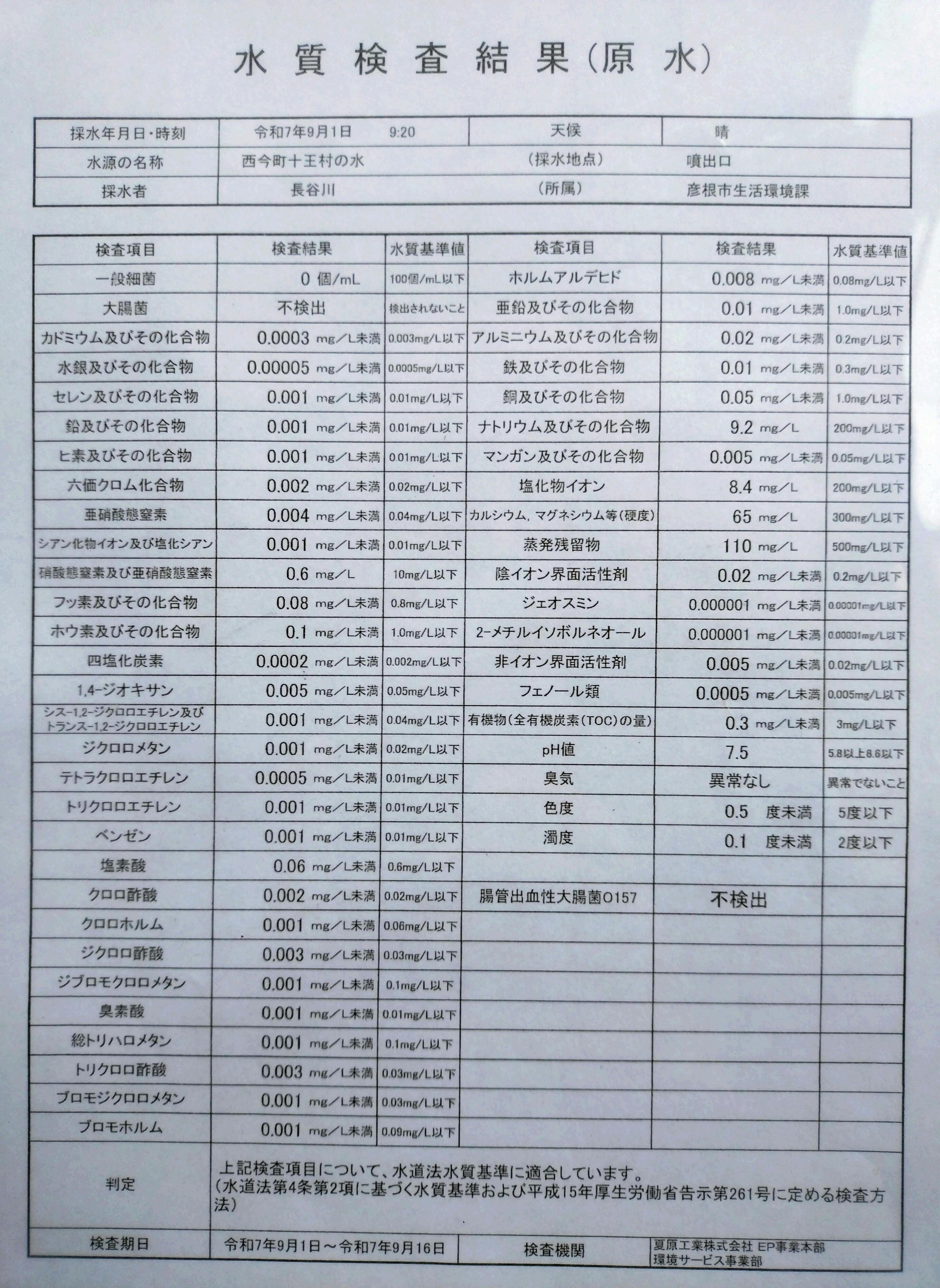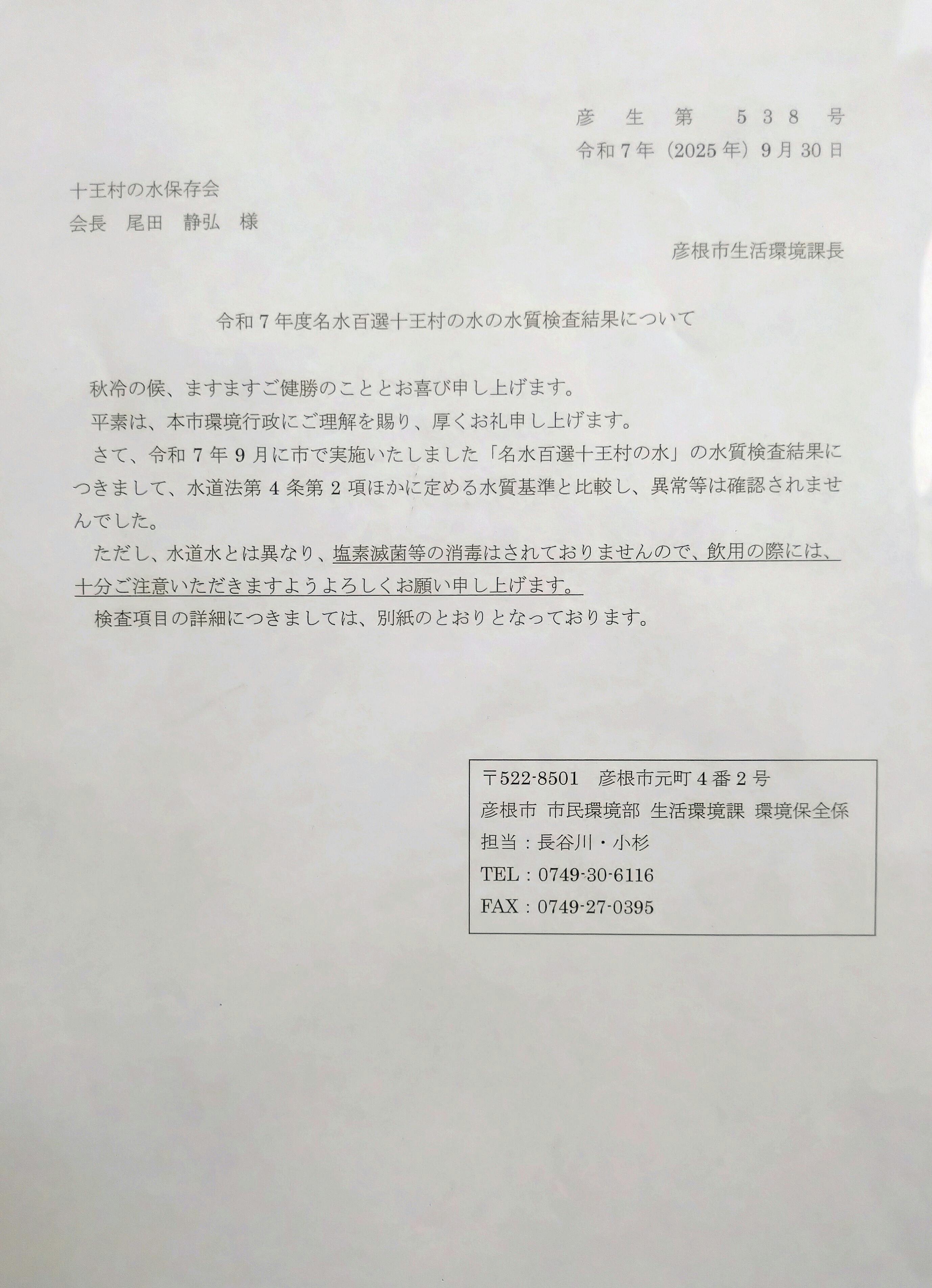 「十王村の水保存会」が毎月清掃を行っており、綺麗な景観と水が保たれています。また、彦根市からの補助により毎年水質検査が行われており、本年も9月30日付けで水質検査結果の報告を受けました。その内容は、以前同様、飲料水として問題の無い水質であることが証明されています。但し、水道水とは異なり、塩素原菌等の消毒はされておりませんので、飲用の際には、十分ご注意いただきますようお願い致します。