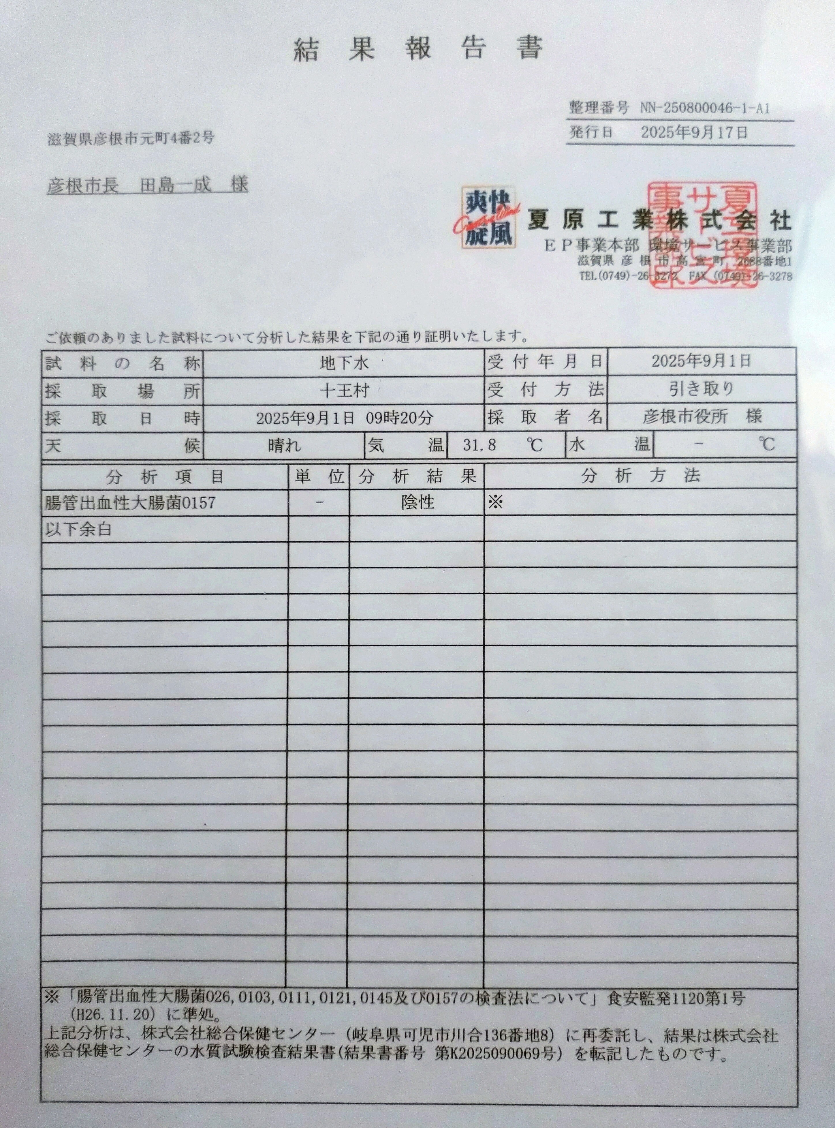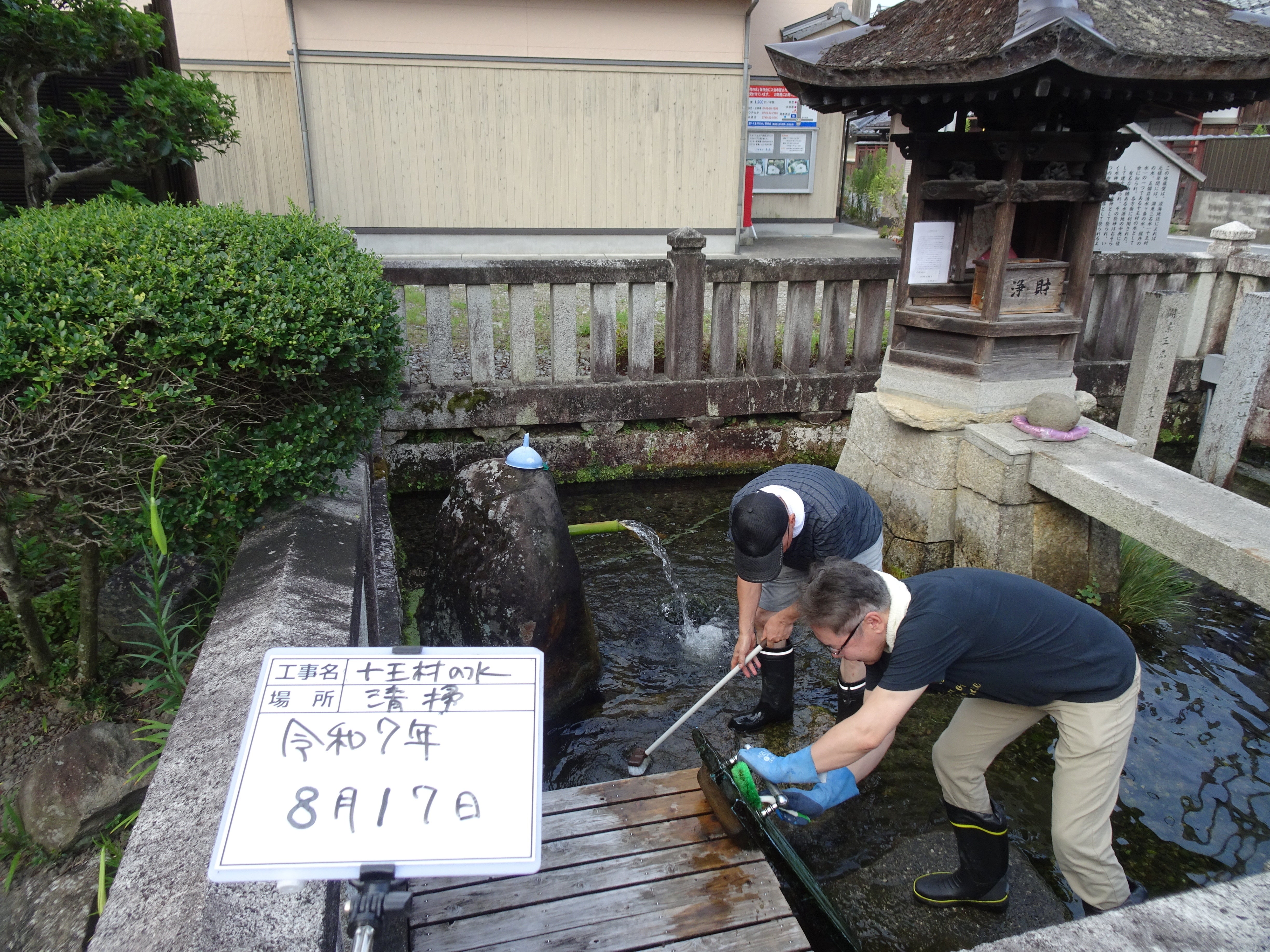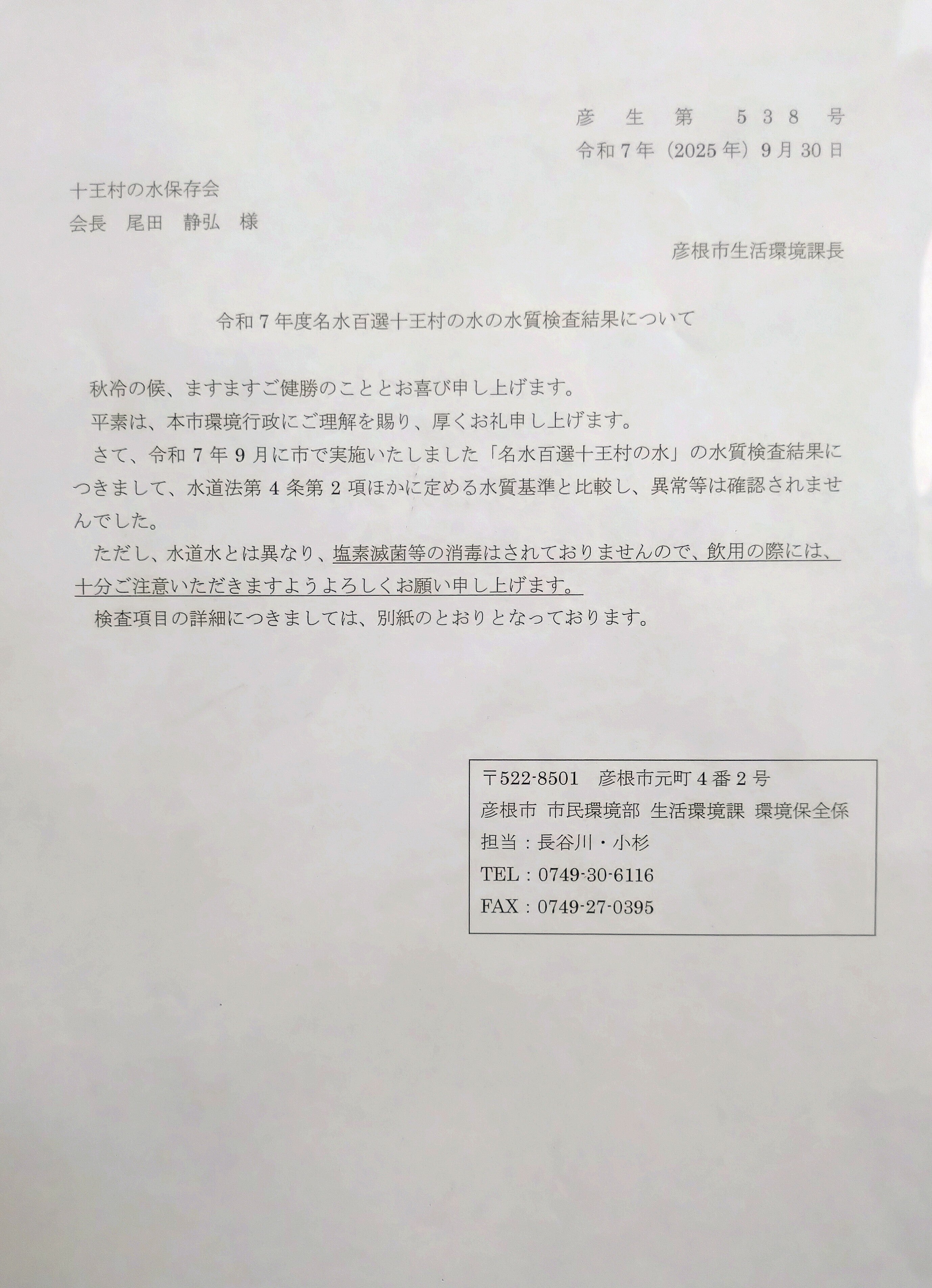 「十王村の水保存会」が毎月清掃を行っており、綺麗な景観と水が保たれています。また、彦根市からの補助により毎年水質検査が行われており、本年も9月30日付けで水質検査結果の報告を受けました。その内容は、以前同様、飲料水として問題の無い水質であることが証明されています。但し、水道水とは異なり、塩素原菌等の消毒はされておりませんので、飲用の際には、十分ご注意いただきますようお願い致します。