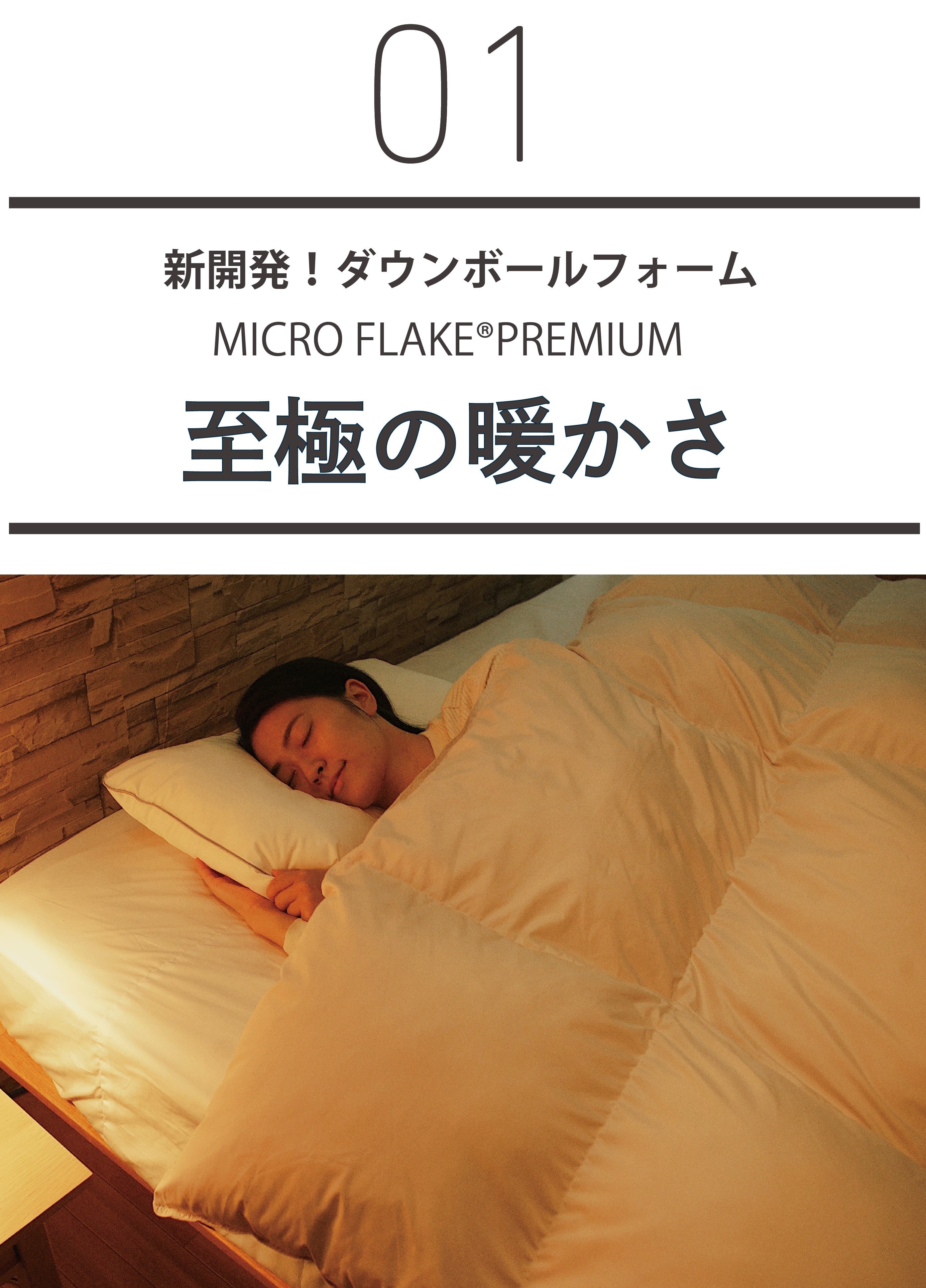 たっぷりと吹き込まれたマイクロ フレイク® プレミアムは、まるで雲に包まれているようなふかふかの寝心地です。