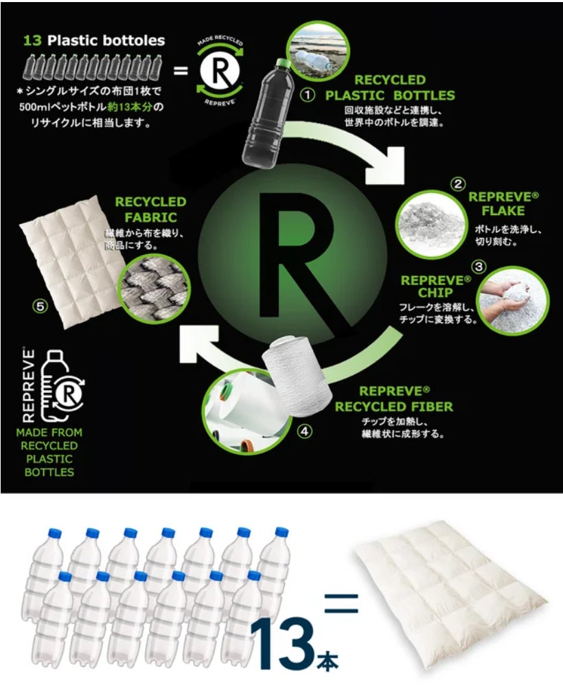 ULTRA 暖睡 COMFORTER PREMIUM 30SQUARESの側生地に使われているREPREVE®は、使用済みのペットボトルなどのリサイクル素材から作られたリサイクル繊維。
