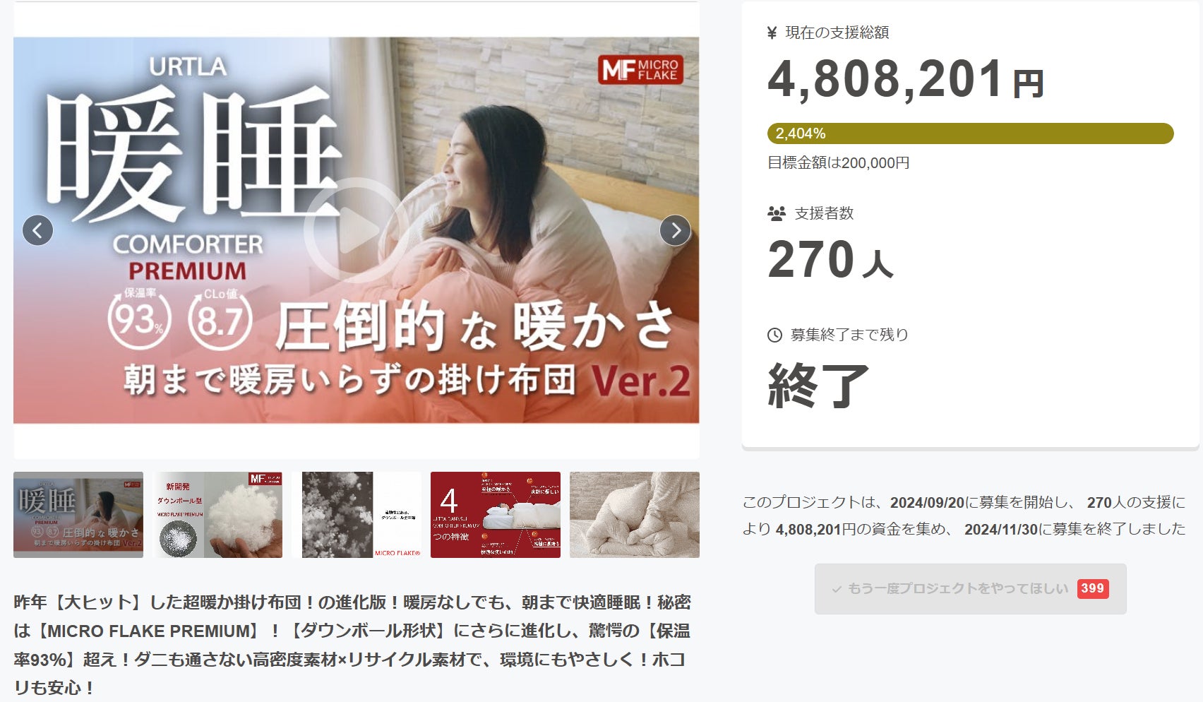 2025/10/04 13:20おかげ様で目標金額を早くも達成できました。沢山の応援ありがとうございます。これから本番です、実感で出来る暖かさ【ウルトラ暖睡コンフォーターPREMIUM30SQ】引き続き応援、拡散よろしくお願いいたします。KITH-PRO 石川 もっと見る
