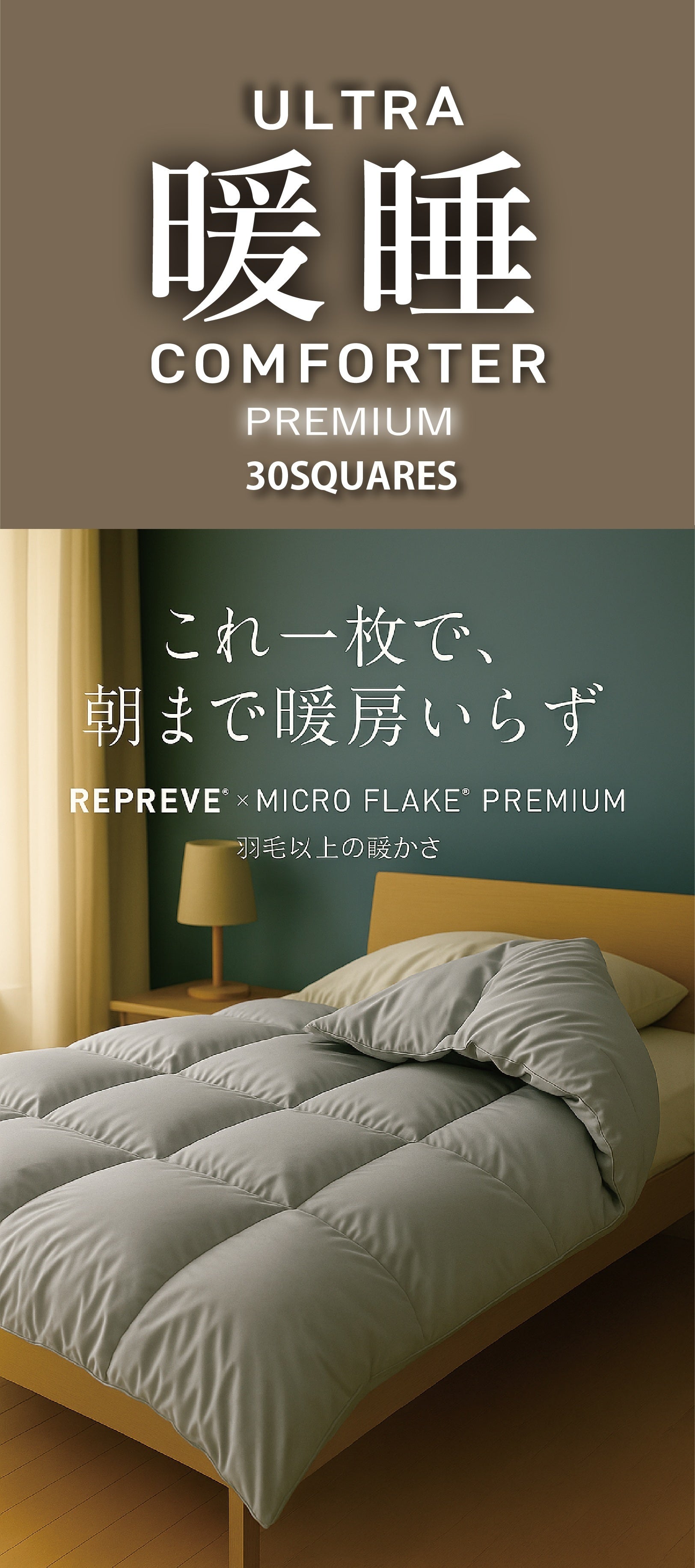 現在の厳しい光熱費高騰の中、家計にやさしく、尚且つ暖かく眠れるためのコンセプトから開発された、ULTRA 暖睡 COMFORTER PREMIUM 30 SQUARESを是非お試し下さい!
