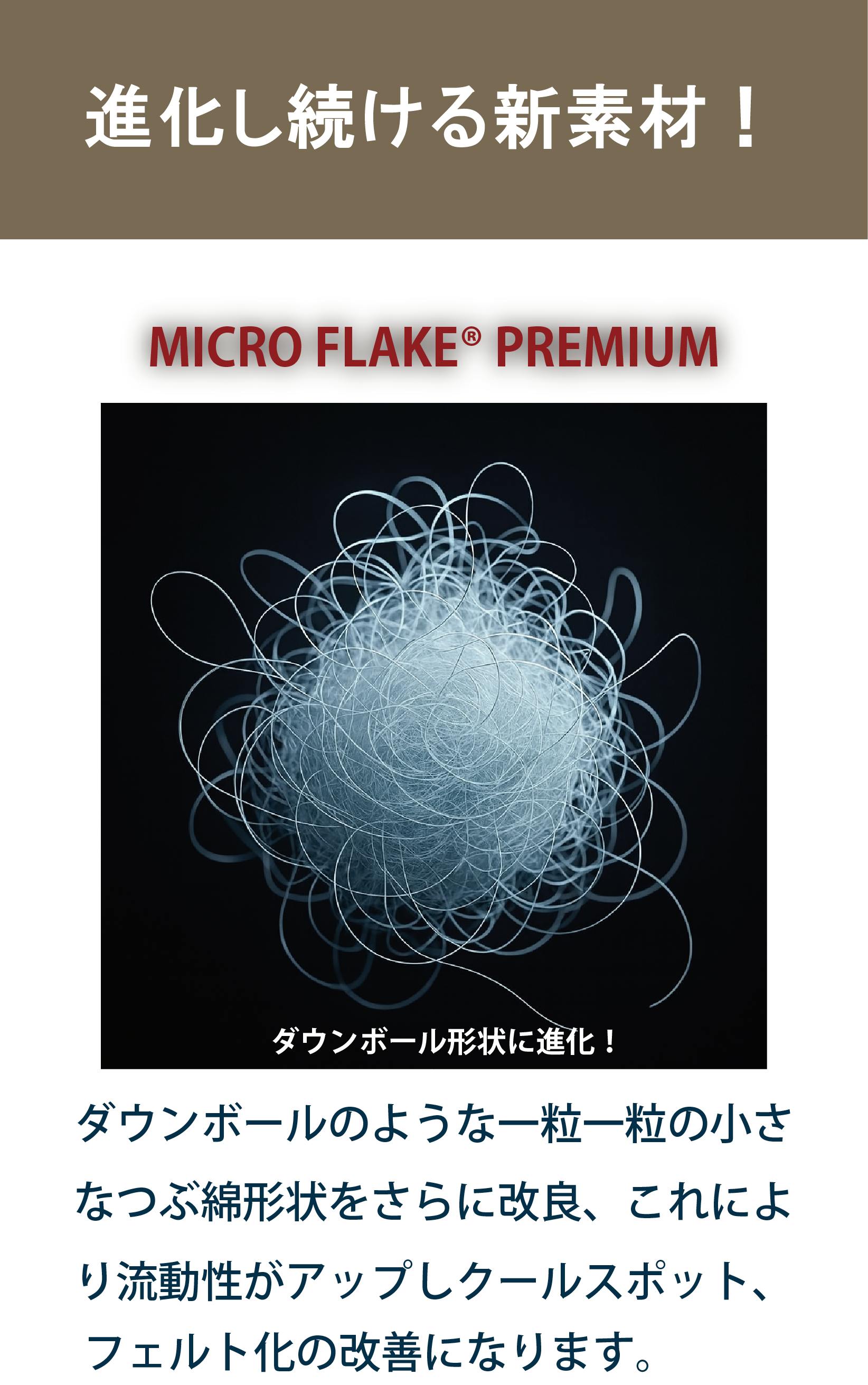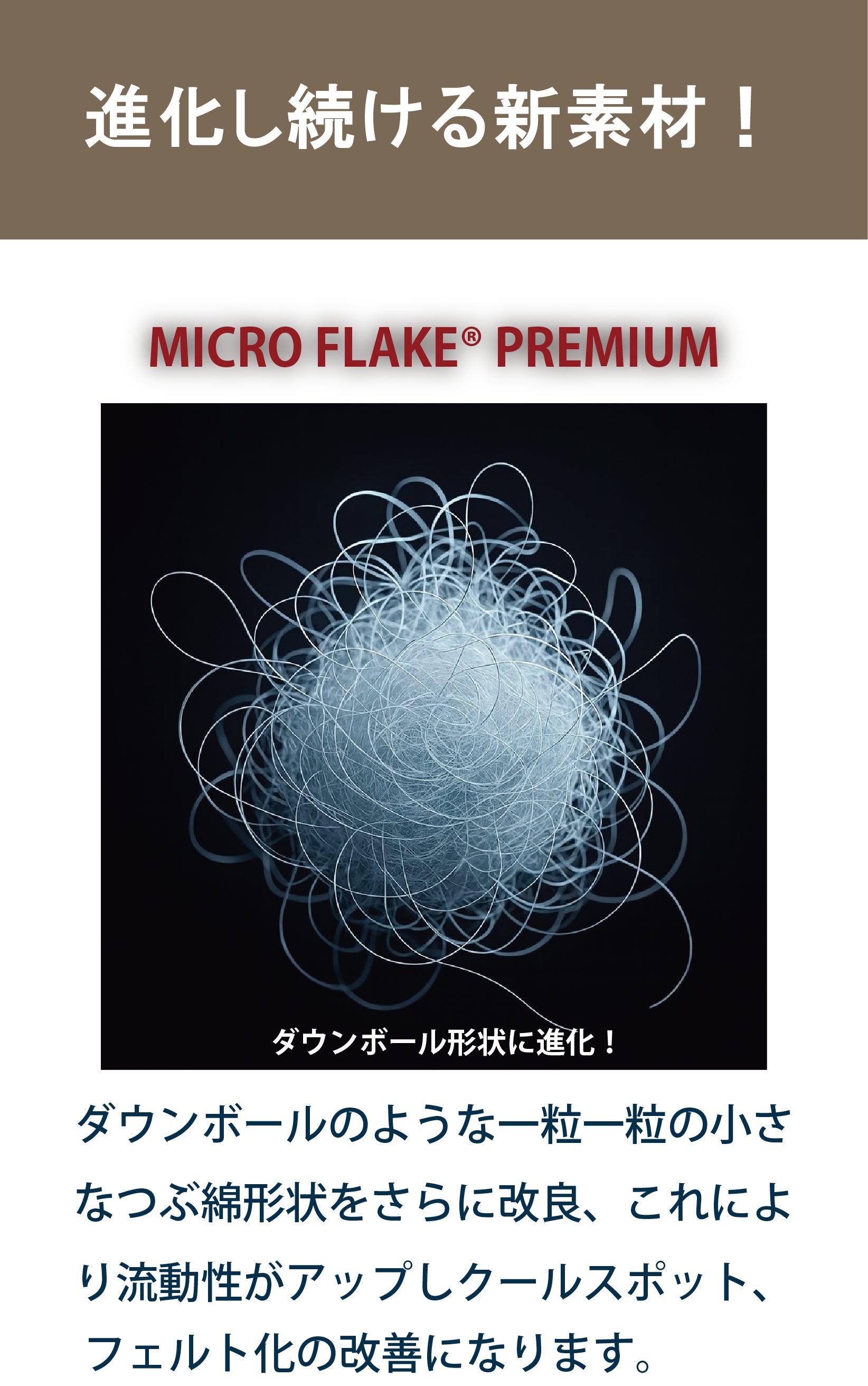 新開発のMICRO FLAKE®PREMIUMによって、中綿がダウンボール状の形状と構造が進化!この進化によって、今までに以上の中綿の流動性が生まれ、中綿のヨレ、フェルト化も軽減され、クールスポットのない羽毛以上の保温力を発揮します。